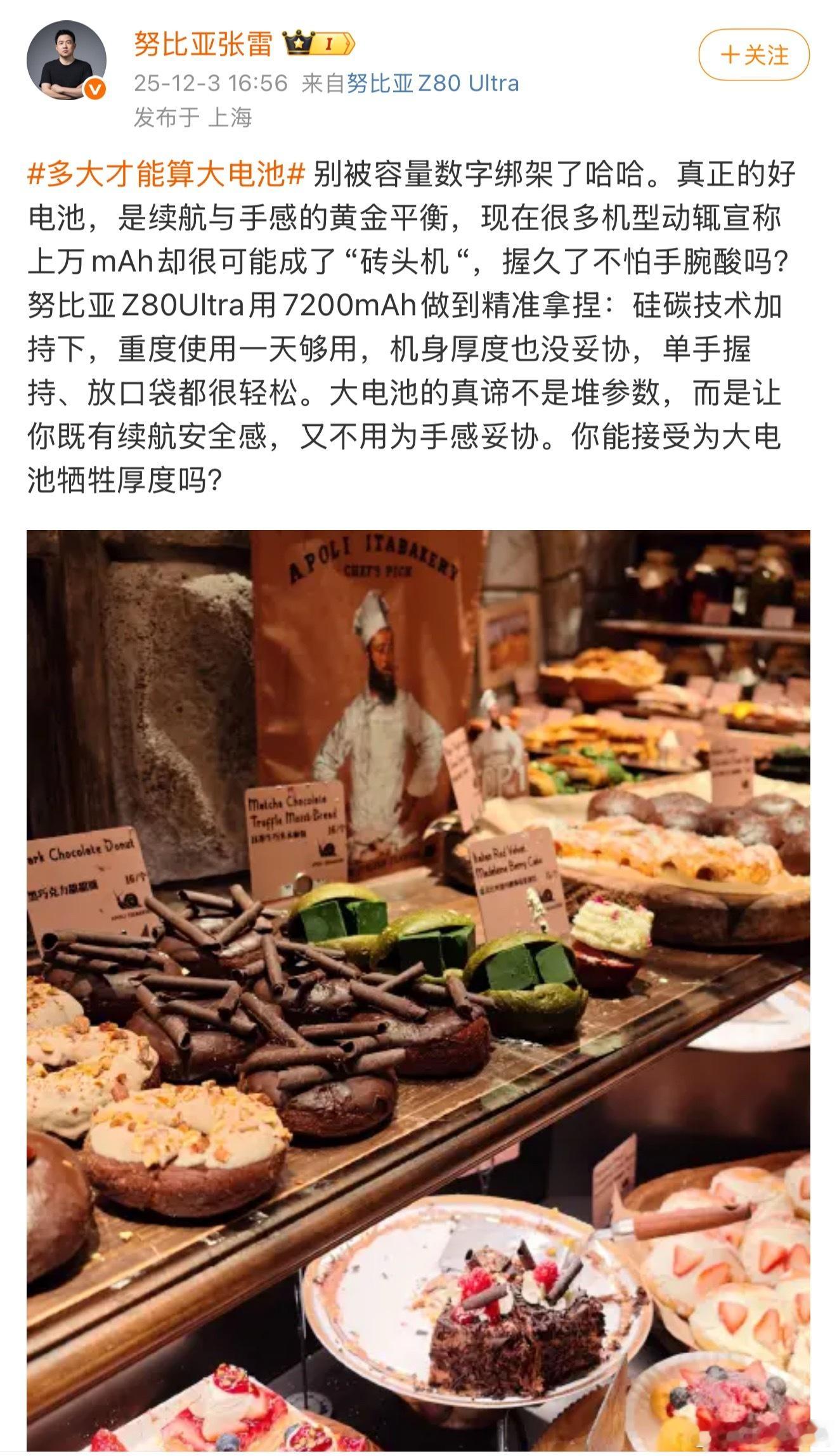 多大才能算大电池早就该跳出比数字的怪圈了,现在不少机型把上万mAh当卖点,厚重机身到手酸,但消费电子的本质是服务人,并不是堆砌参数。努比亚Z80Ultra的7200mAh,硅碳技术加持下,重度使用撑一天没问题,机身厚度却没妥协,单手握持、塞口袋都不费劲。我们要的不是电池容量冠军,而是不用担心没电,也不用迁就手感的踏实。厂商都在卷数字,那守住“实用优先”的底线,才是真的懂用户。大家为大电池妥协过手感吗?