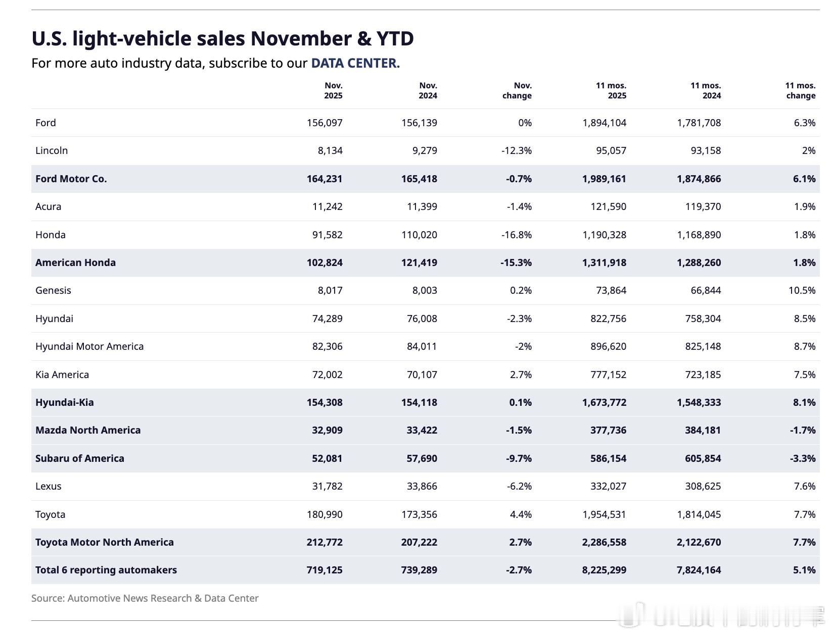 美国11月的销量也出炉。由于电动汽车需求疲软和销售天数减少,美国轻型车销量将在 11 月连续第二个月下滑。J.D. Power-Global Data、S&P Global Mobility 和 Cox Automotive 预计该市场在 11 月将下降 5.2% 至 7.8%。从品牌角度来说是喜忧参半,丰田、起亚和福特在上升,其他品牌都在下降。整体来看,美国新车库存还是很多J.D. Power 和 GlobalData 表示,零售乘用车和轻型卡车库存在十一月底为 229 万辆,比去年同期增长 12%,十一月的库存天数为 64 天,比一年前增加了 5 天。同时11 月新车零售成交均价将达到 46,029 美元,比 2024 年 11 月上涨 722 美元。上个月丰田集团的销量增长了 2.7%,其中丰田品牌销量上升 4.4%,但雷克萨斯销量下降 6.2%,终止了该豪华品牌连续四个月的增长。丰田销量主要依靠SUV贡献,SUV交付量增长了6.6%,主要由四大金刚-4Runner、Highlander、Grand Highlander 和 Sequoia驱动。同时丰田的电车也大幅下滑。丰田 bZ4X 和雷克萨斯 RZ上个月销量均大幅走弱。不仅仅是丰田,其他品牌的电动车销量也大幅下滑。福特的电动汽车销量下降了 61%,至 4,247 辆,其中 F-150 Lightning 降幅为 72%,Mustang Mach-E 降幅为 49%。导致福特上个月交付量下滑 0.7%,其中福特品牌销量下降 0.2%,林肯下降 12%。另外本田的电动车也是大幅下滑。其中Honda Prologue 下降 87%,以及已停产的 Acura ZDX 下降 98%。同时由于半导体短缺,导致产量和库存下降。所以11月本田的SUV和皮卡销量下滑了 21%。导致本田公司销量下滑 15%,其中本田品牌销量下降 17%,讴歌下降 1.4%。韩系销量还是可圈可点的,现代汽车的销量下降了 2.3%,至 74,289 辆,而起亚则增长了 2.7%,达到 72,002 辆。虽然现代的核心电动车 Ioniq 5 和 Ioniq 6 的销量下滑了 56%,但是三个SUV-途胜、胜达和帕里斯德——上个月均实现了两位数的增长。起亚也是如此,K5、嘉华和狮铂拓界的两位数增长帮助起亚克服了两款关键电动车 EV6 和 EV9 销量同比下滑 57%的影响。整体来说,美国的市场已经有点进入垃圾时间,小院高墙的最好写照。只要进去了就是一片坦途,这也可以理解为啥日韩一定要死磕美国市场,毕竟这么容易赚钱的地方太难得了。海外新车销量大v聊车