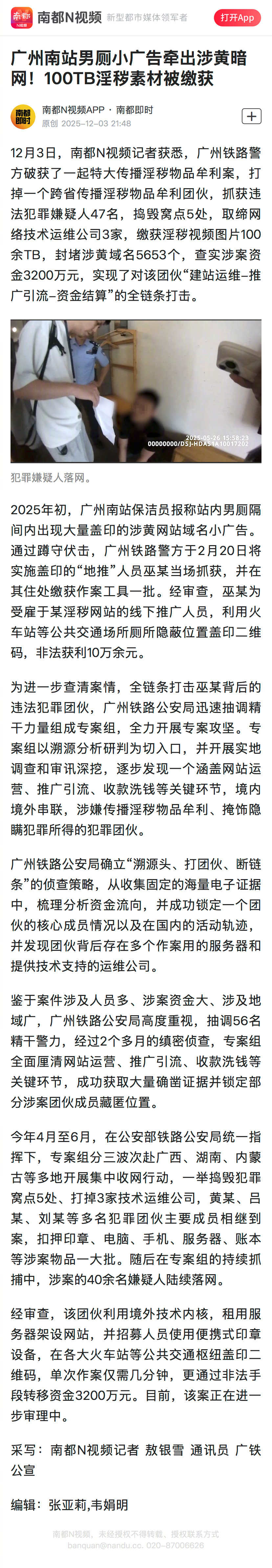 #广州南站男厕小广告牵出百TB淫秽内容#【广州南站男厕小广告牵出涉黄暗网!100TB淫秽素材被缴获】#广州铁警从厕所广告溯源捣毁涉黄团伙#12月3日,南都N视频记者获悉,广州铁路警方破获了一起特大传播淫秽物品牟利案,打掉一个跨省传播淫秽物品牟利团伙,抓获违法犯罪嫌疑人47名,捣毁窝点5处,取缔网络技术运维公司3家,缴获淫秽视频图片100余TB,封堵涉黄域名5653个,查实涉案资金3200万元,实现了对该团伙“建站运维-推广引流-资金结算”的全链条打击。 南都N视频记者 敖银雪 通讯员 广铁公宣