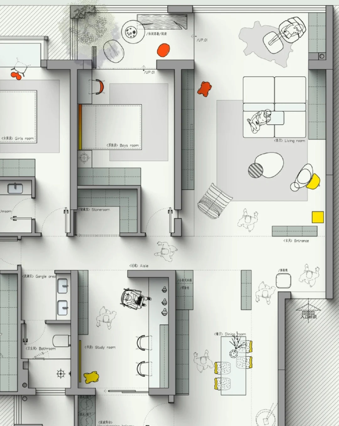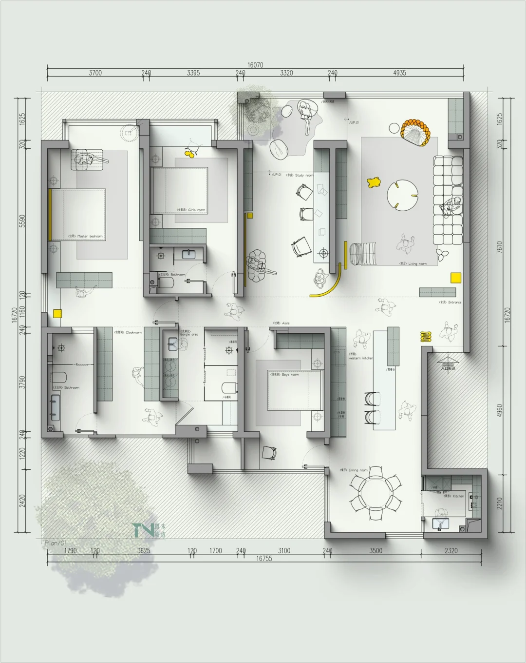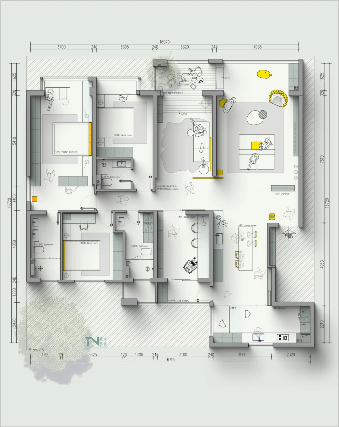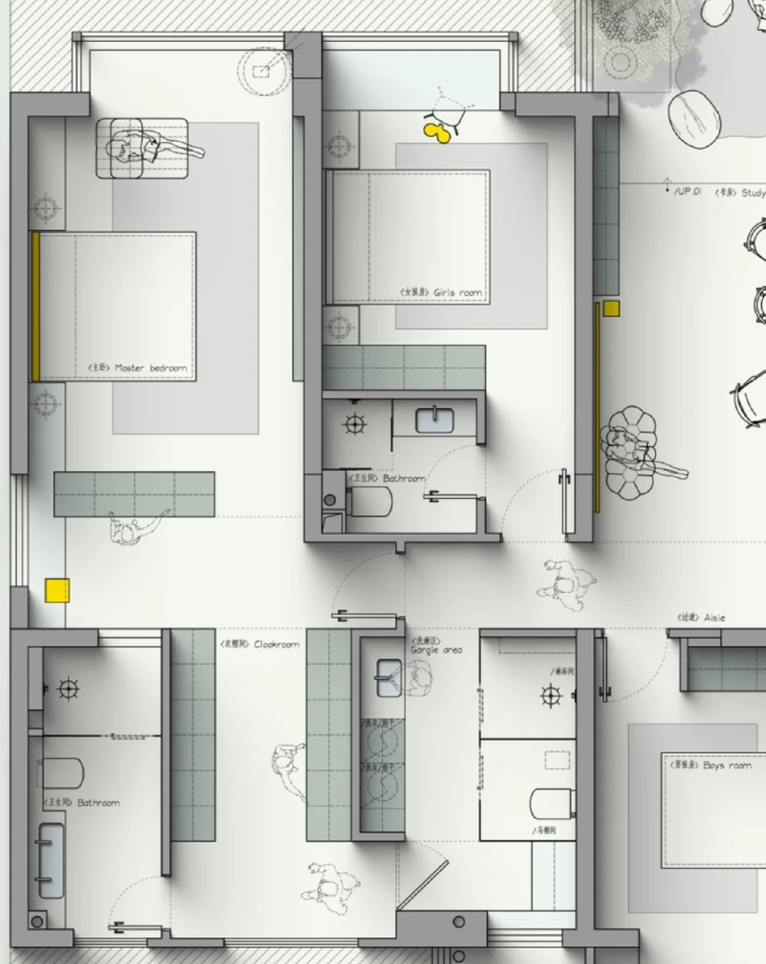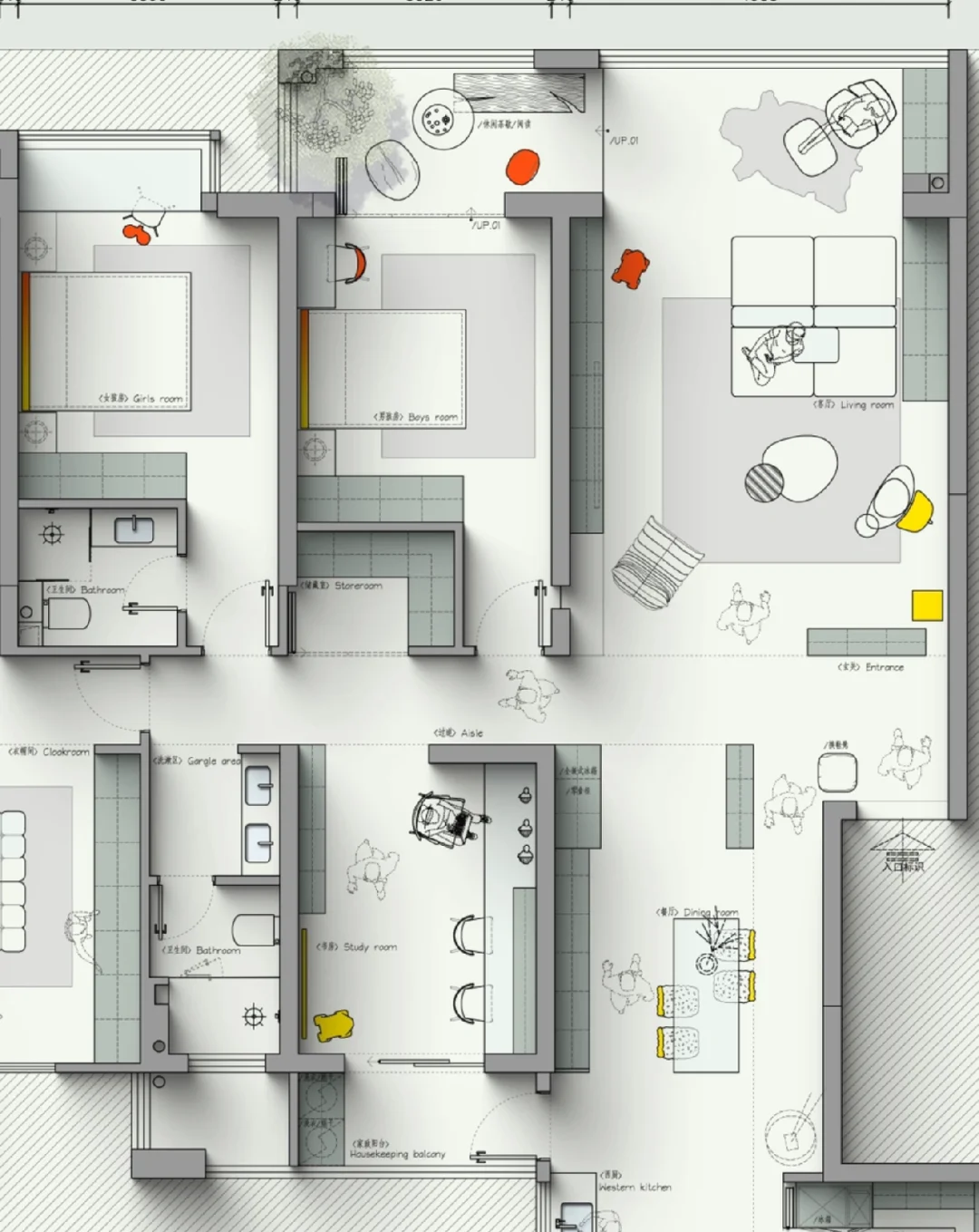 满满承重墙如何打破原用格局,创造灵活动线 设计需求 1、四口之家,女儿6岁 儿子5岁 2、主卧卫生间双台盆,三分区,多点衣柜 3、两个儿童房(女儿带套卫)、一个可以一起学习 4、厨房做开放式,不需要岛台 大平层需要视野上看起来够大,够通透 北阳台设备间可封窗