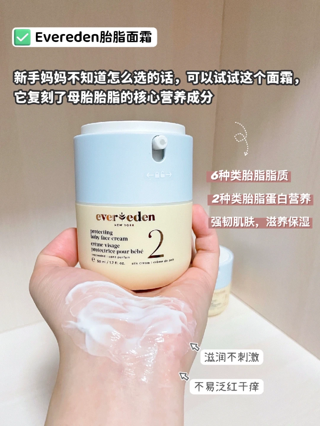 Evereden胎脂面霜就很推荐。它复配胎脂营养的脂质和蛋白,内外协同帮助宝宝肌肤健康成长,建立起茁壮的皮肤屏障,很适合新生儿或者皮肤容易干燥发红的宝宝,而且涂完能保持长时间滋润,不会有干痒感,坚持使用可以避免难缠的肌肤问题。