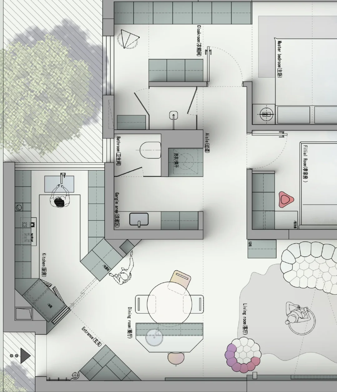 设计需求: 1、两个卧室 2、衣帽间 3、封闭式厨房 4、三分离