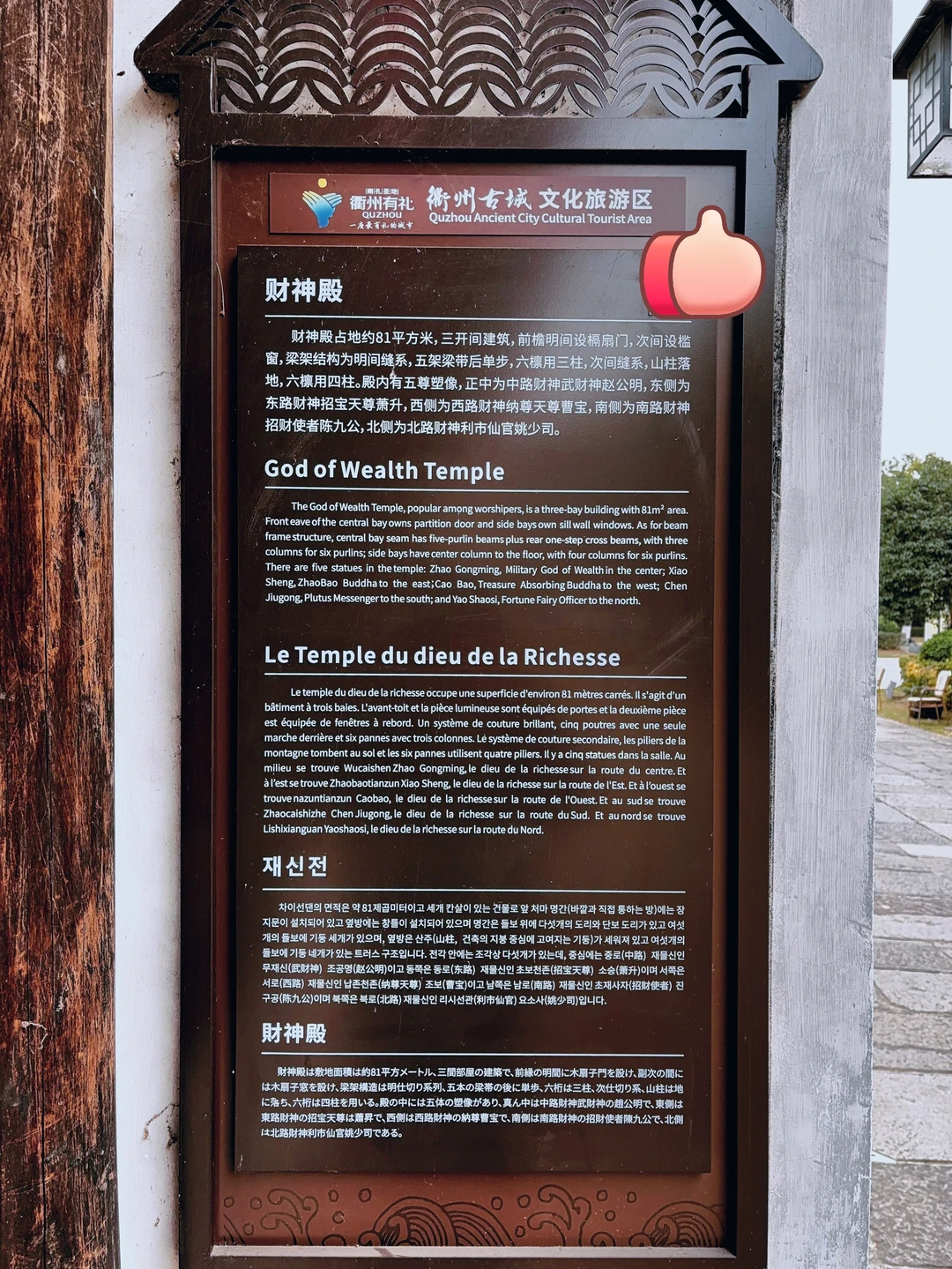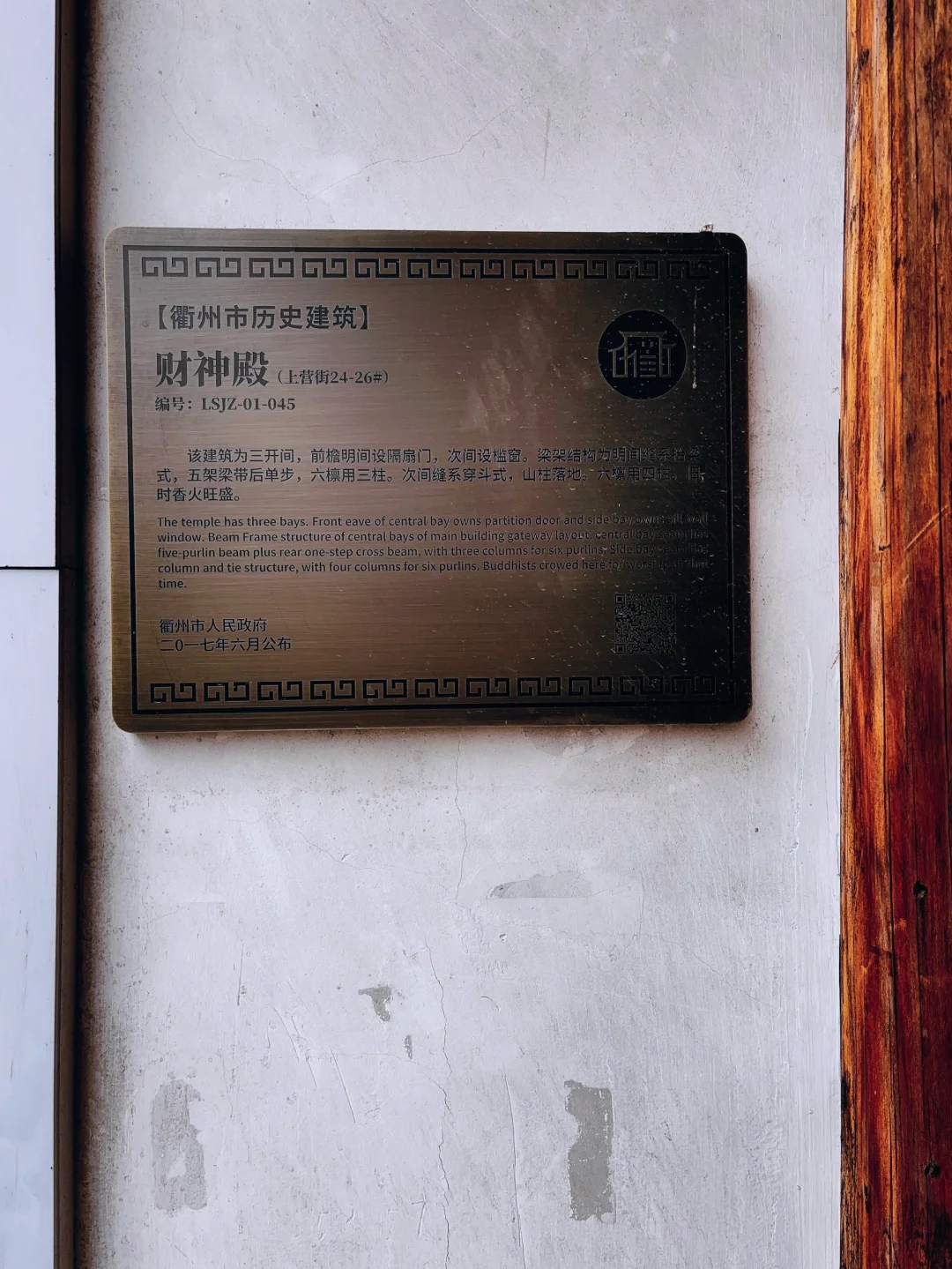 欢迎各位发财人来我的主页看更多道观云游笔记📝 [吐舌头H]来衢州了!! [吐舌头H]位于水亭门历史文化街区的“五路财神殿”,地方虽不大,但是来往的游客都会进去拜拜。 [星R]殿内有五尊塑像 💰正中为中路财神武财神赵公明 💰东侧为东路财神招宝天尊萧升 💰西侧为西路财神纳尊天尊曹宝 💰南侧为南路财神招财使者陈九公 💰北侧为北路财神利市仙官姚少司 🧨🧨马上过年了,大家发财就对了!!!