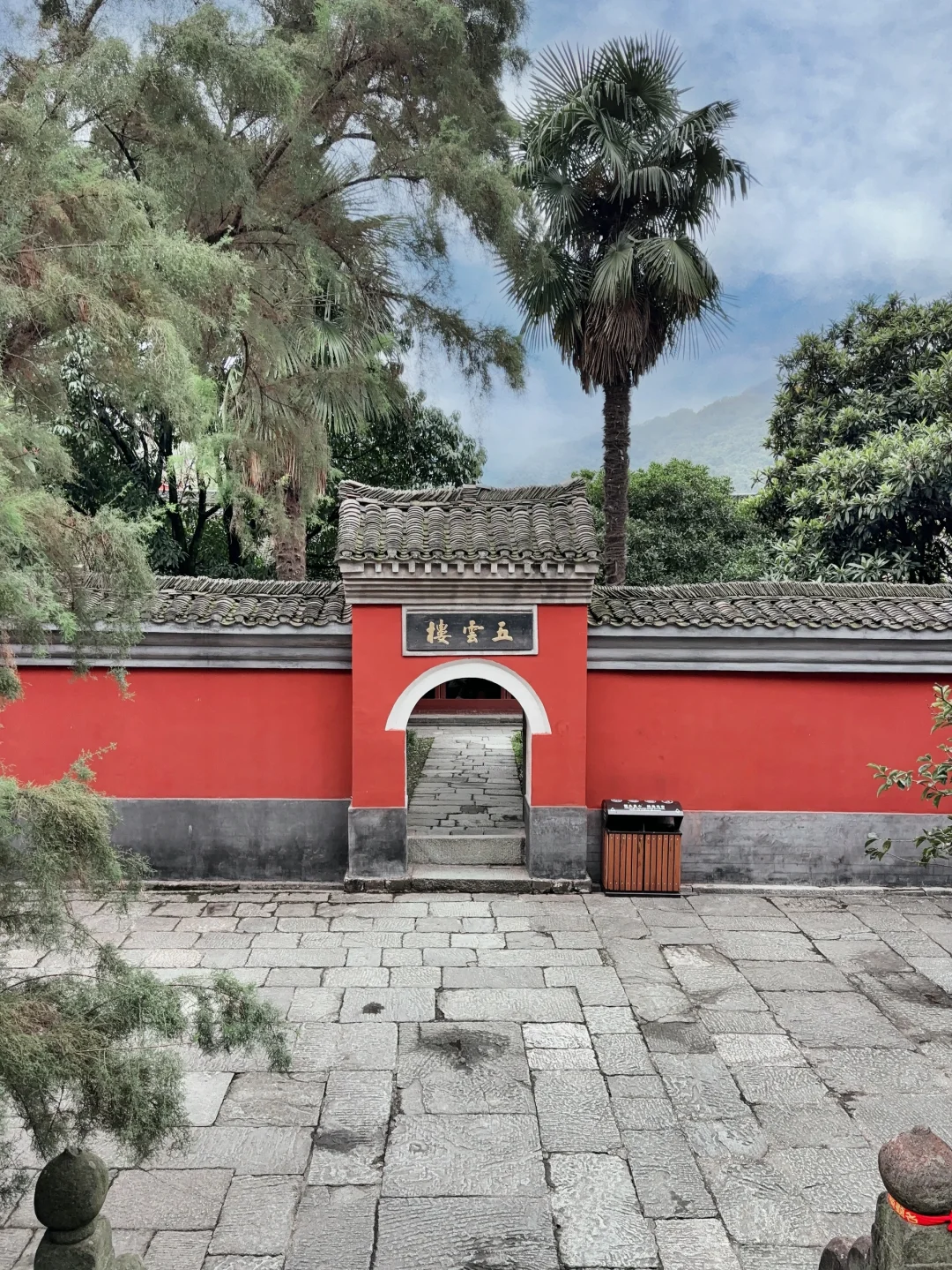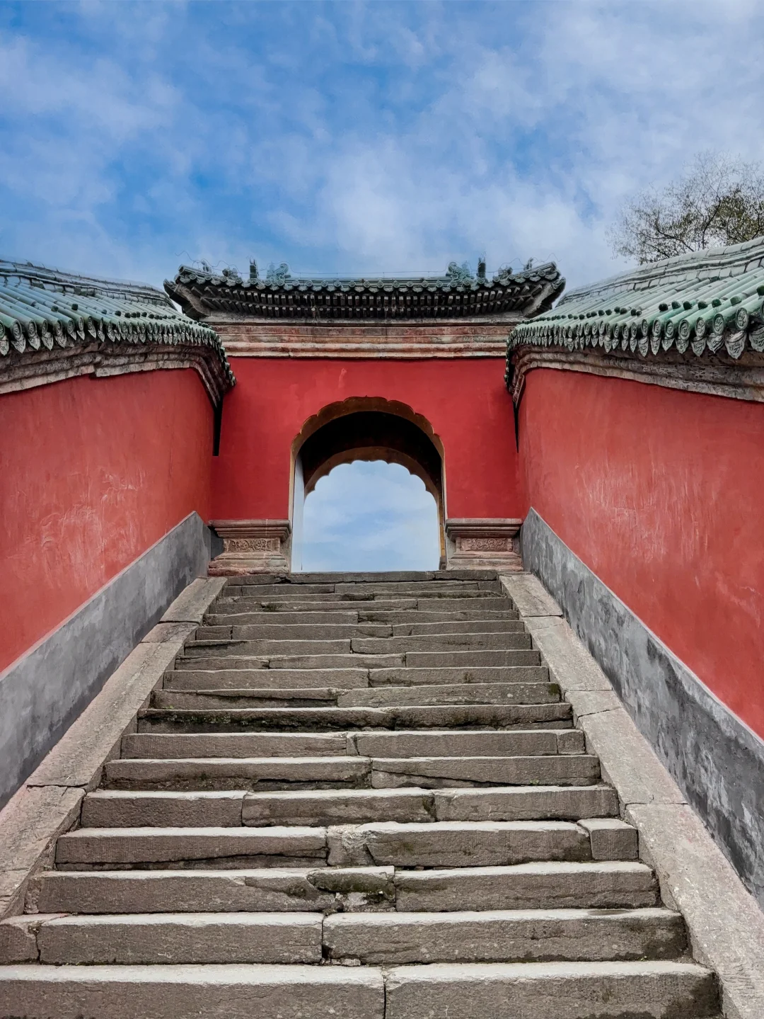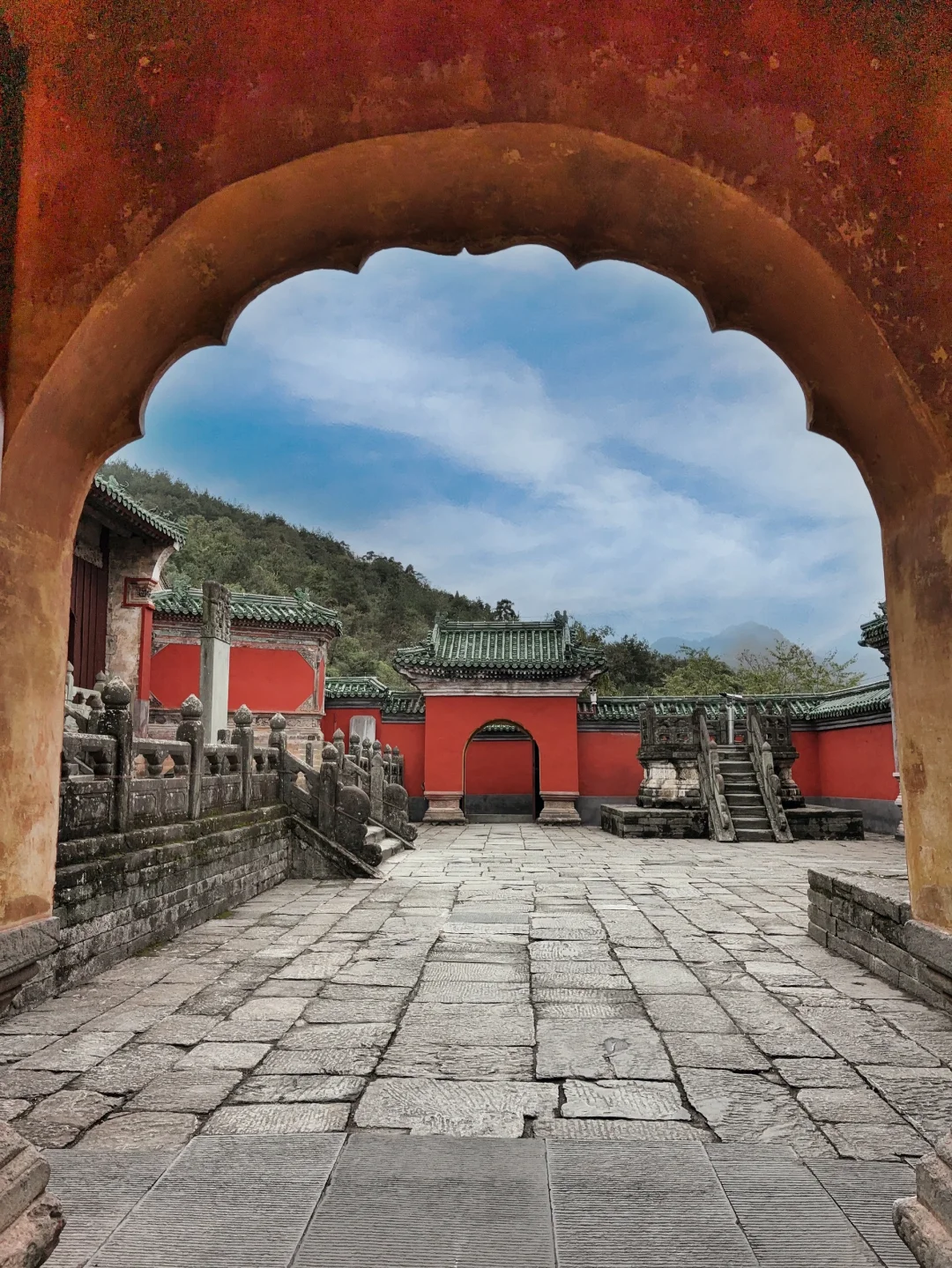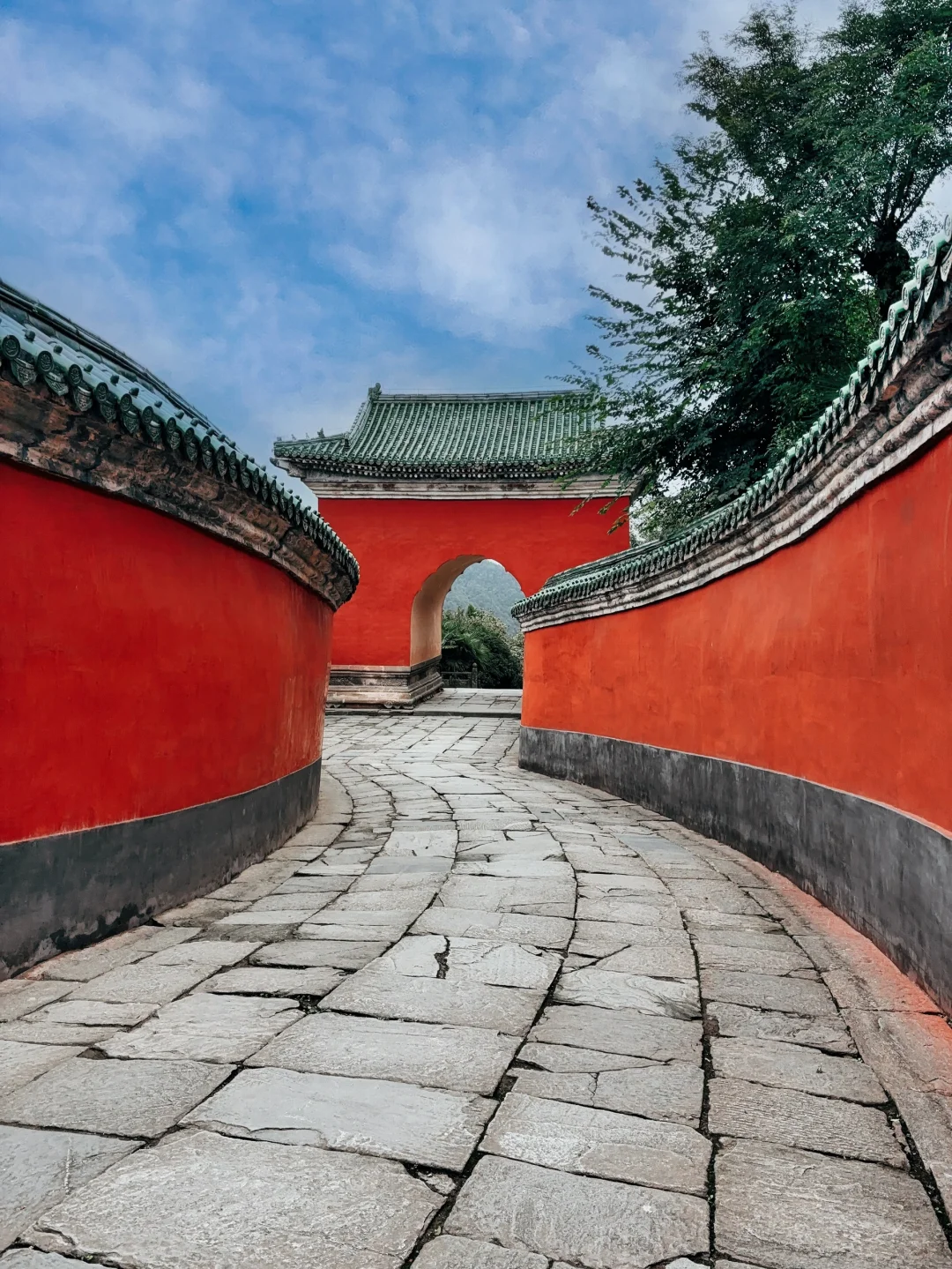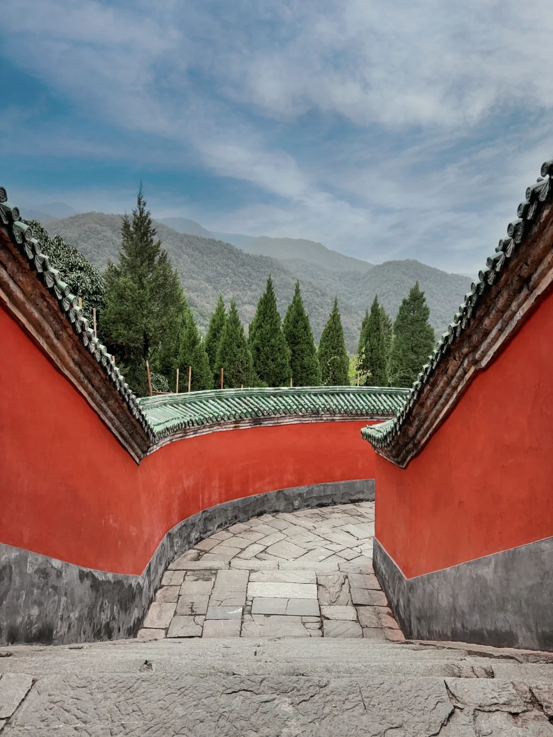 ☯️太子坡的山门是一条长长的古道,因为路面犹如波浪起伏,也叫“九曲黄河墙”,这条古道是武当山景区蕞热门的打卡地之一,红墙绿瓦非常出片,穿过依山起伏的九曲黄河墙,就是复真观大殿。