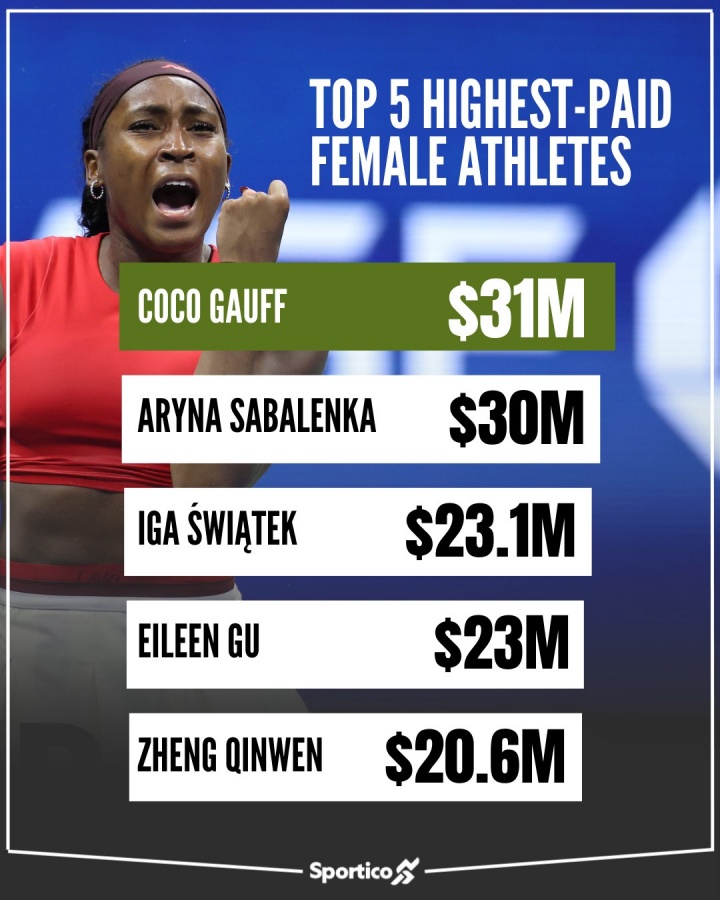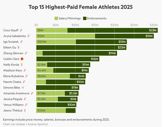 直播吧12月04日讯sportico公布2025年女运动员收入最高top15,高芙第1,谷爱凌第4,郑钦文第5。