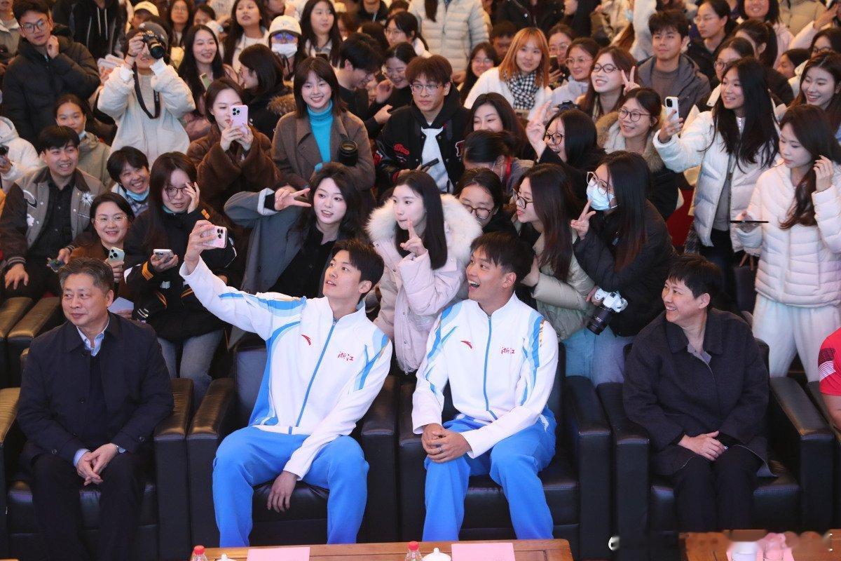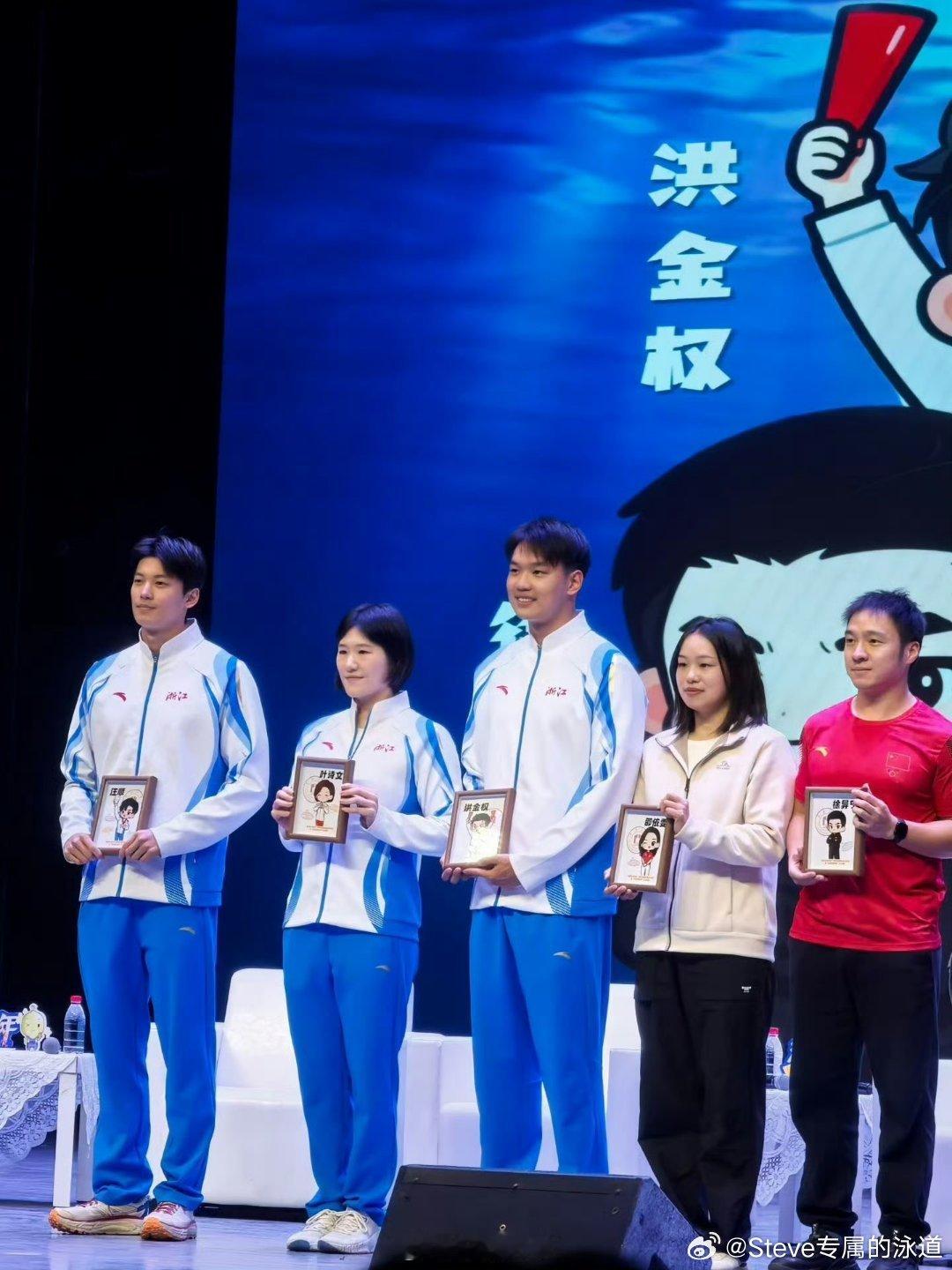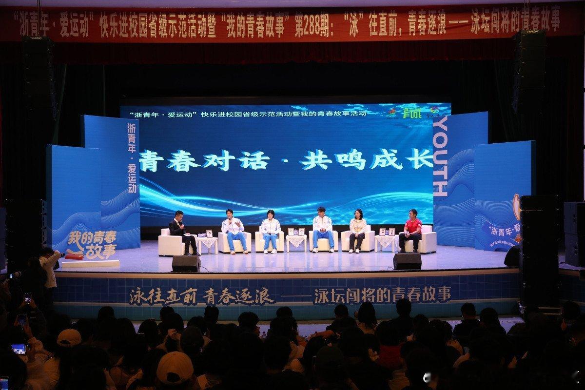 12月3日下午,宁波大学“浙青年·爱运动”快乐进校园省级示范活动暨“我的青春故事”第288期:“泳”往直前,青春逐浪——泳坛闯将的青春故事圆满落幕!汪顺、叶诗文、洪金权、邵依雯四位泳坛明星,以及科研保障员徐异宁,以一场真诚温暖的对话,为宁大学子献上一场关于拼搏、坚持与传承的青春思享会。汪顺的第五届全运会汪顺叶诗文洪金权宁大讲座顺流而上游泳(图|宁波大学)