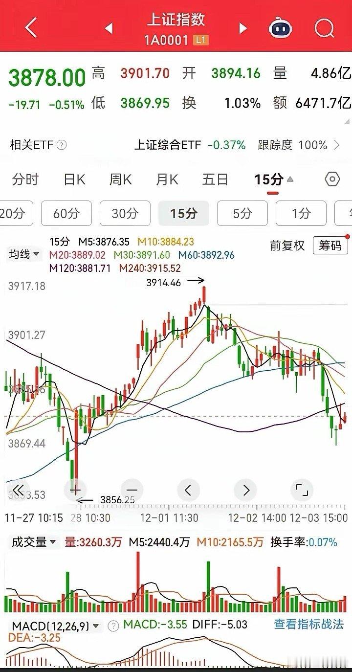 一觉醒来,发现昨夜美股三大指数全线上涨,那么今天大盘会涨吗?这个可不一定,要知道昨夜金龙中国指数是下跌的。请看图,这个是大盘的15分钟级别的K线图,可见大盘已经跌破了这个级别的60均线,准备向下啊。波动向下重新向下调整,至少要调整3波或者5波,现在第一波调整结束,向上反抽一下,所以今天上午会反抽一下。也就是说上午会涨一涨,但是后面又会下跌,所以说还是不能抄底。