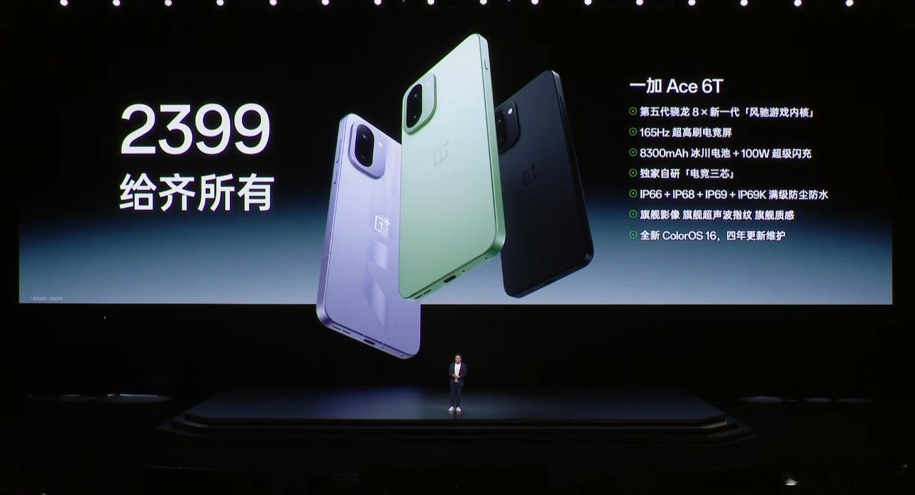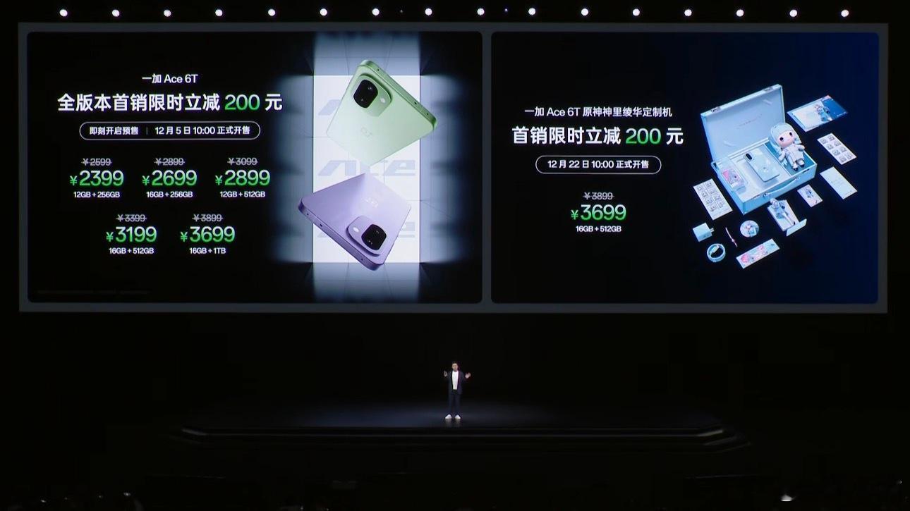 一加Ace6T售价2399元起:12+256GB 2399元16+256GB 2699元12+512GB 2899元16+512GB 3199元16+1TB 3699元原神神里绫华定制版3699元(16+512GB)