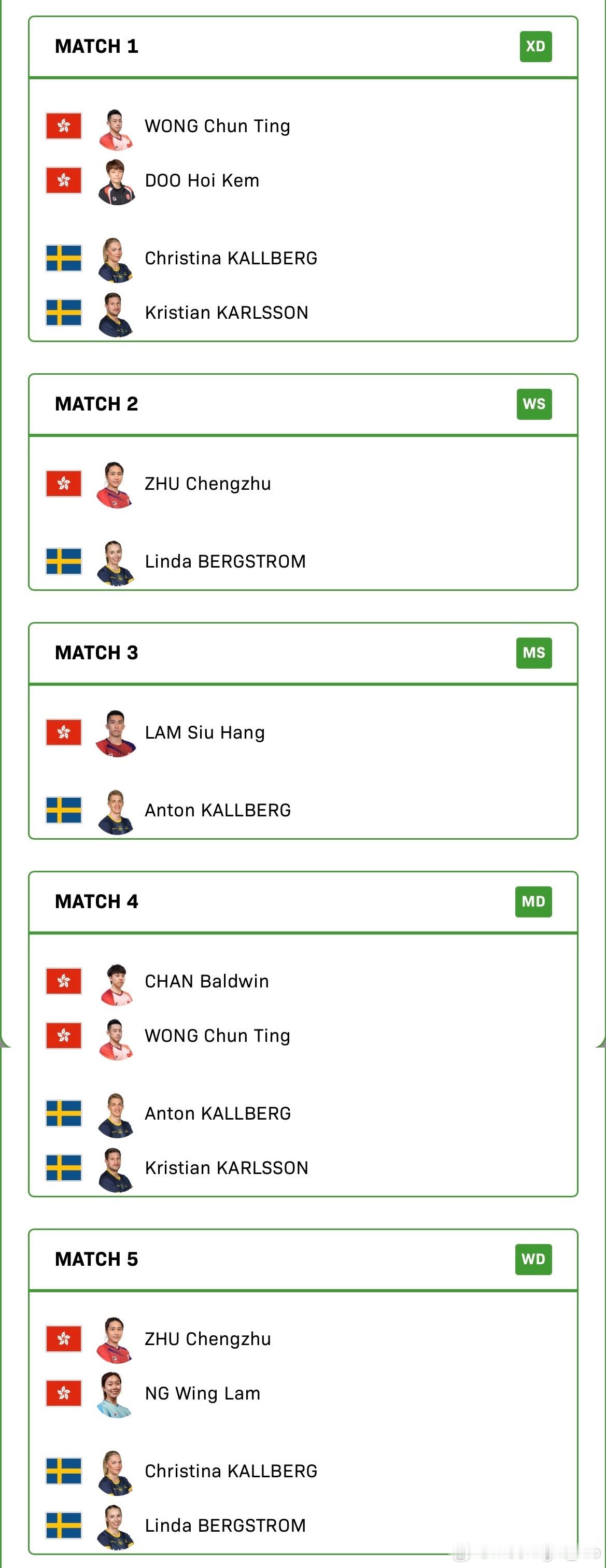 2025成都混合团体世界杯 第二阶段🇭🇰中国香港🆚瑞典🇸🇪杜凯琹/黄镇廷卡尔森/C·卡尔伯格朱成竹🆚琳达·伯格斯特隆林兆恒安东·卡尔伯格黄镇廷/陈颢桦🆚卡尔森/A·卡尔伯格吴咏琳/朱成竹🆚琳达/C·卡尔伯格
