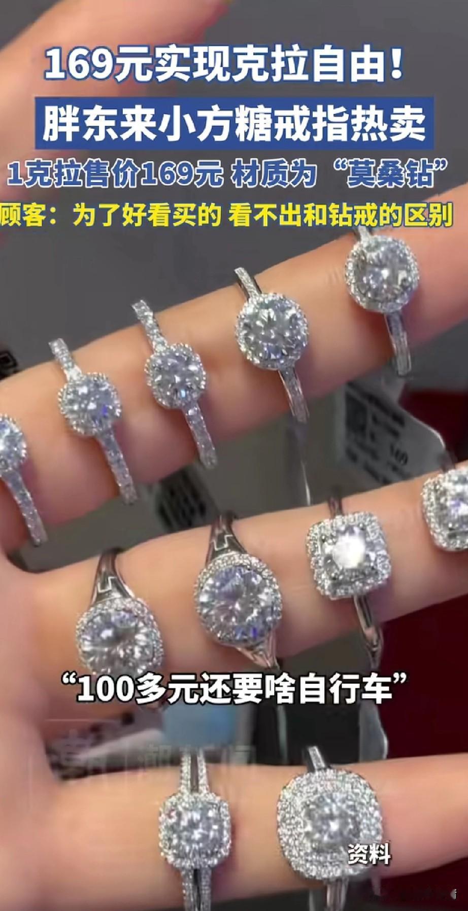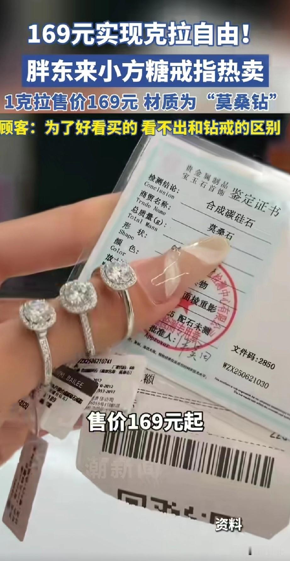 胖东来小方糖戒指热卖, 1克拉只需要169元, 材质为莫桑钻, 每一枚戒指都有鉴定证书, 检测结果为合成碳硅石, 你还别说这戒指造型真的好看, 根本看不出来和钻戒有什么区别, 100多块还要什么自行车? 怪不得会热卖, 100多买了开心很值得, 平时待着也不丢分, 也不用担心会丢失, 如今二手平台上有很多人卖这款戒指, 目前供不应求, 胖东来几乎卖断货, 大家在胖东来买着也放心, 毕竟品质有保证, 想出来小方糖戒指的人真是人才, 大家对于胖东来小方糖戒指大火怎么看? 胖东来 小方糖足金戒指 5d方糖戒指 爱心方糖戒指 甜王钻戒