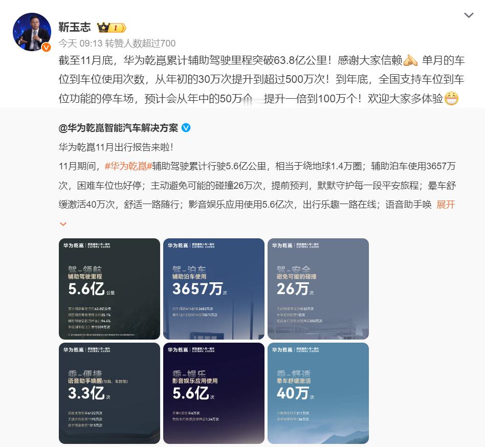 车若初见 大家对车位到车位热情高涨啊,华为靳玉志表示,单月车位到车位使用次数从30万提升到500万,全国支持车位到车位的停车场,预计从年中的50 万个,提升一倍到100 万个。大家体验过这些功能吗?觉得怎么样。