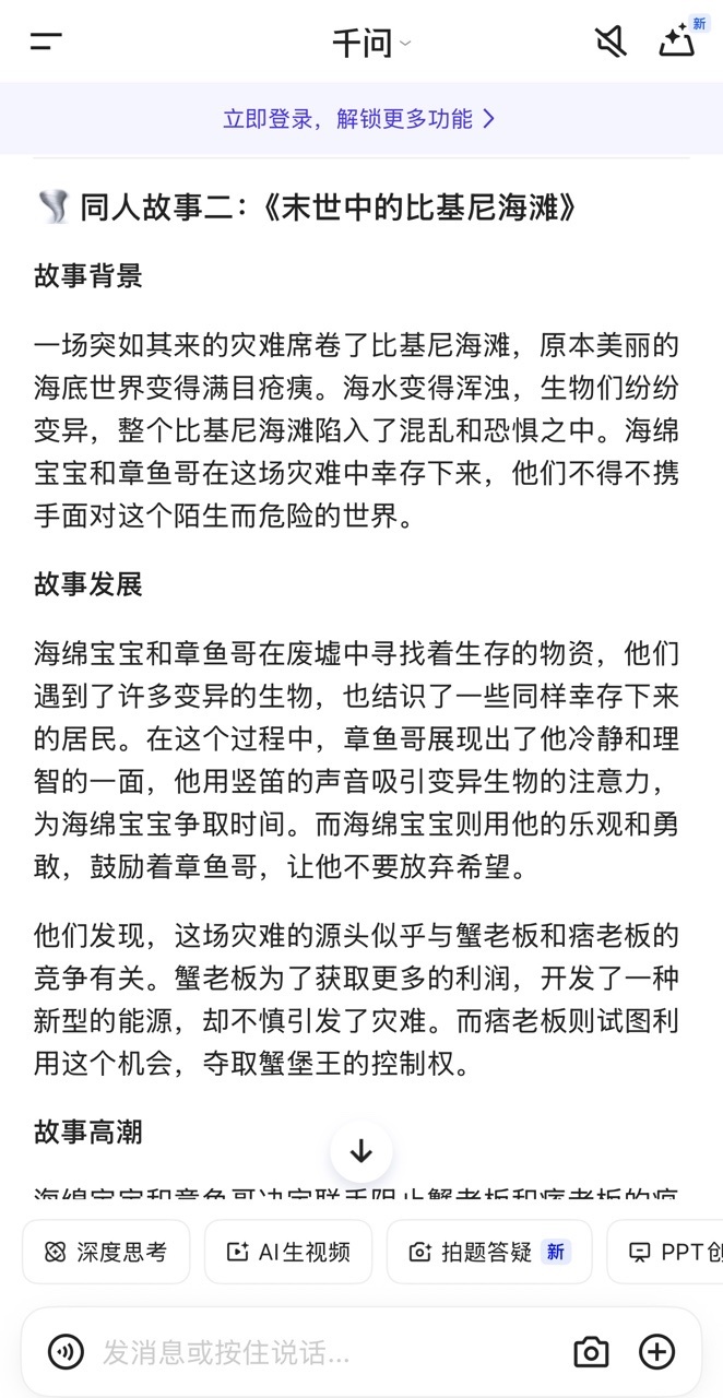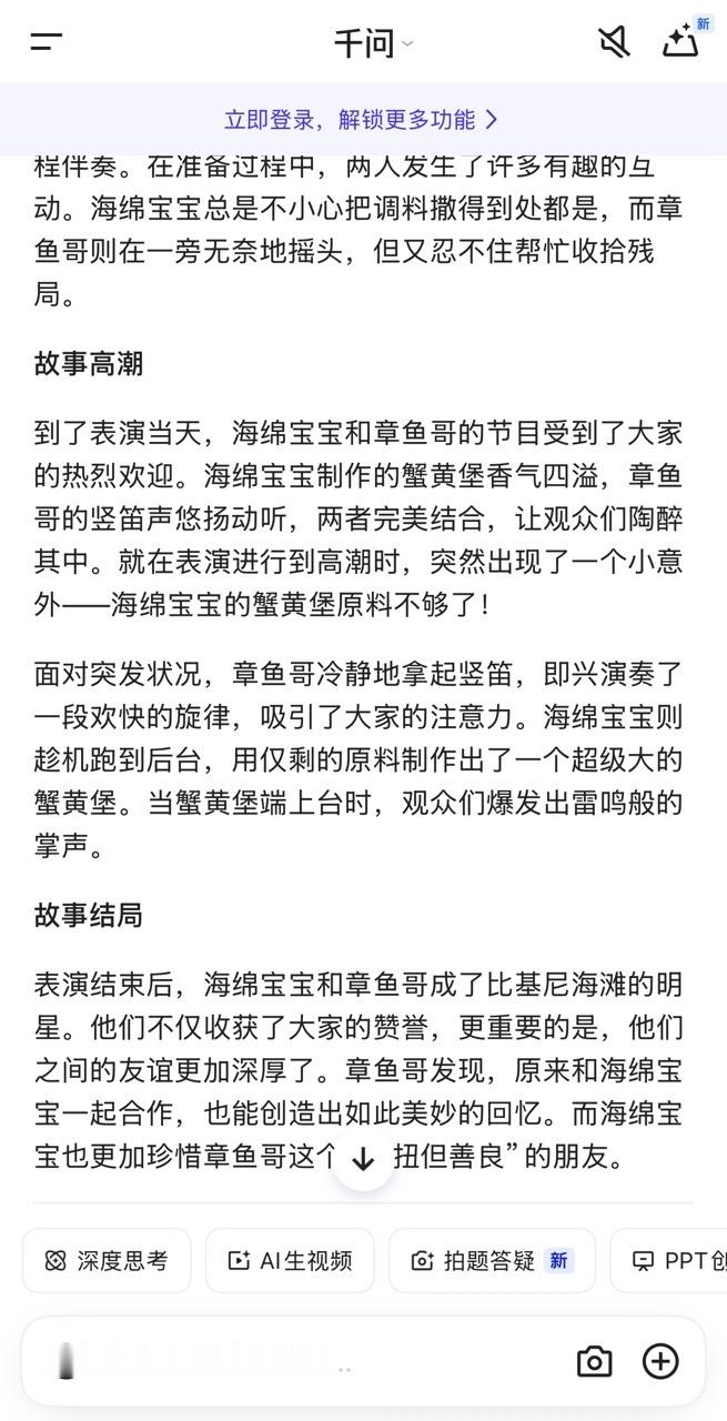 00后有自己的ai磕爱文学 什么都磕只会营养均衡,谁还没吃到海绵宝宝和章鱼哥我都会伤心的OK?没头脑的乐天派、不高兴的大苦瓜放在一起简直绝配!为此我狂用千问产出,别说,AI做饭太香了,磕的我是不知天地为何物!海绵宝宝章鱼哥