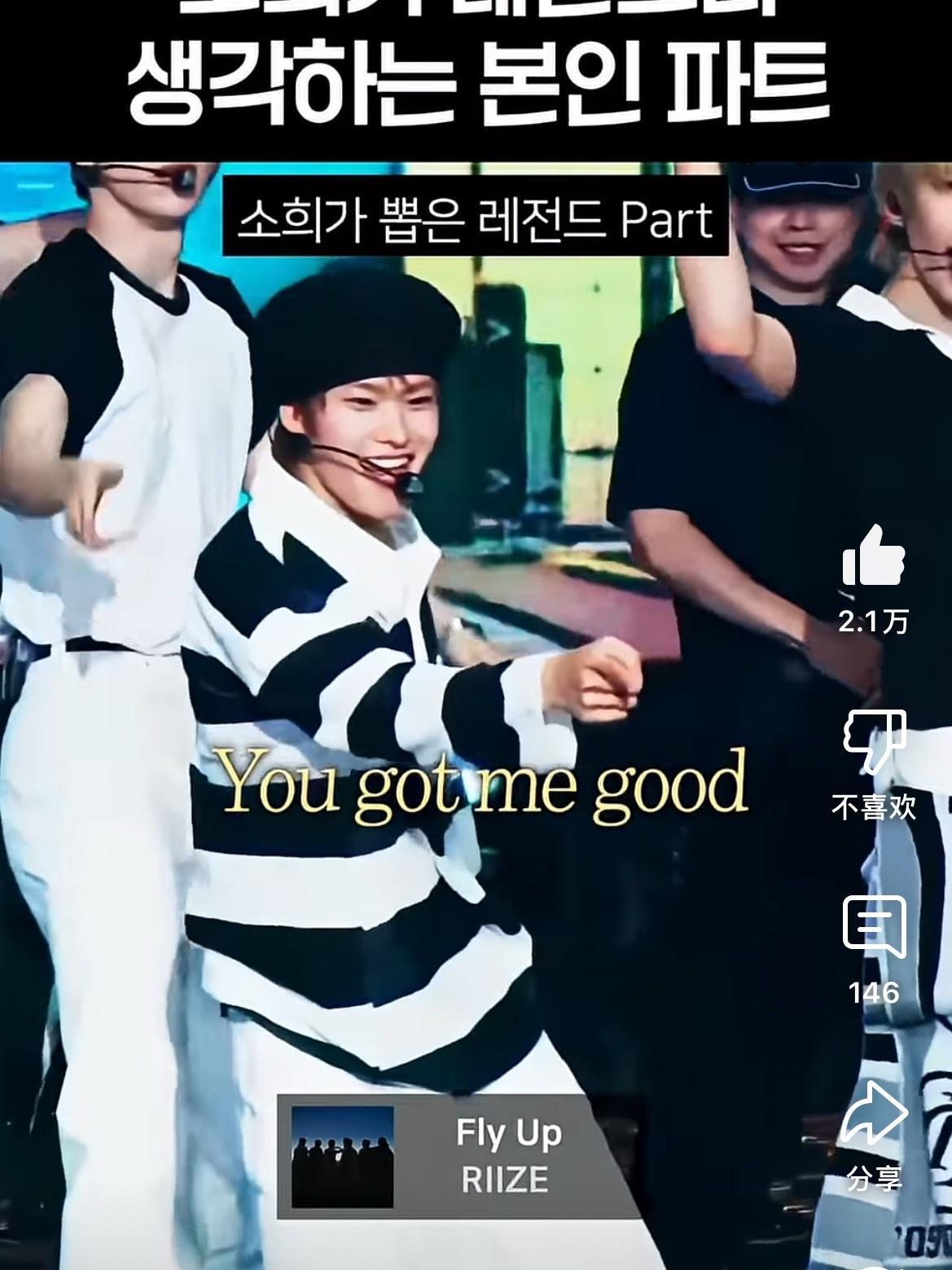 油管新增一则个人100w播放量short“【RIIZE】炤熙选出的传奇名场面片段”分别是ts仙桥和fly up “You got me good”(都是自己的歌曲part)