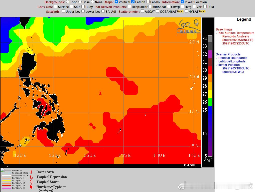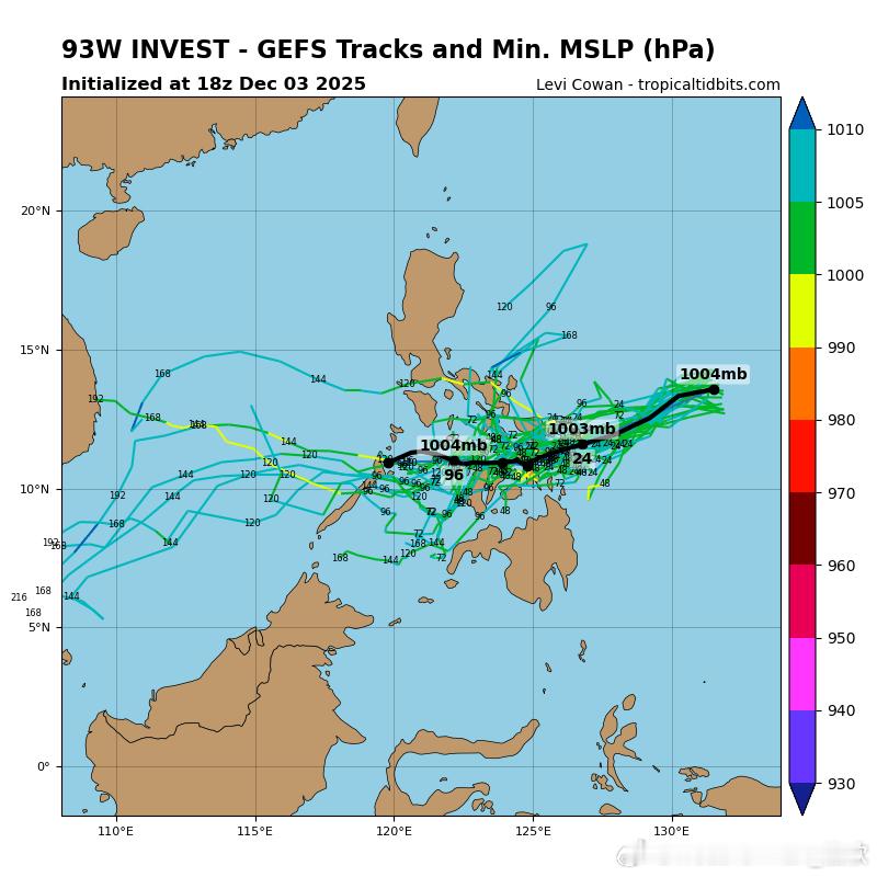 【台风展望】目前在菲律宾东侧的扰动93W,对流有所增强。未来继续西行。环境条件相对有利,垂直风切变不大,海温在29℃左右,强度应该会继续增强。本周末到下周初可能增强到热带风暴级别,进而成为28号台风洛鞍。