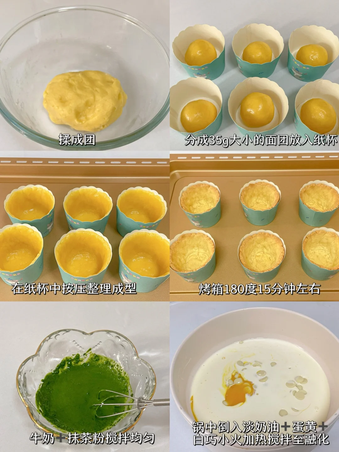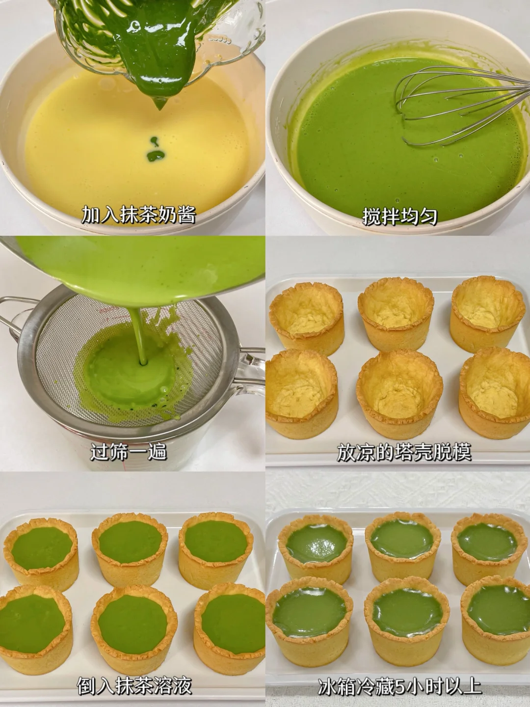 3⃣️牛奶+抹茶粉充分搅拌均匀,锅中倒入淡奶油+蛋黄+白巧克力小火加热搅拌至融化,加入抹茶奶酱搅匀,过筛一遍,倒入抹茶溶液至已脱模放凉的塔壳中,放入冰箱冷藏5小时以上。