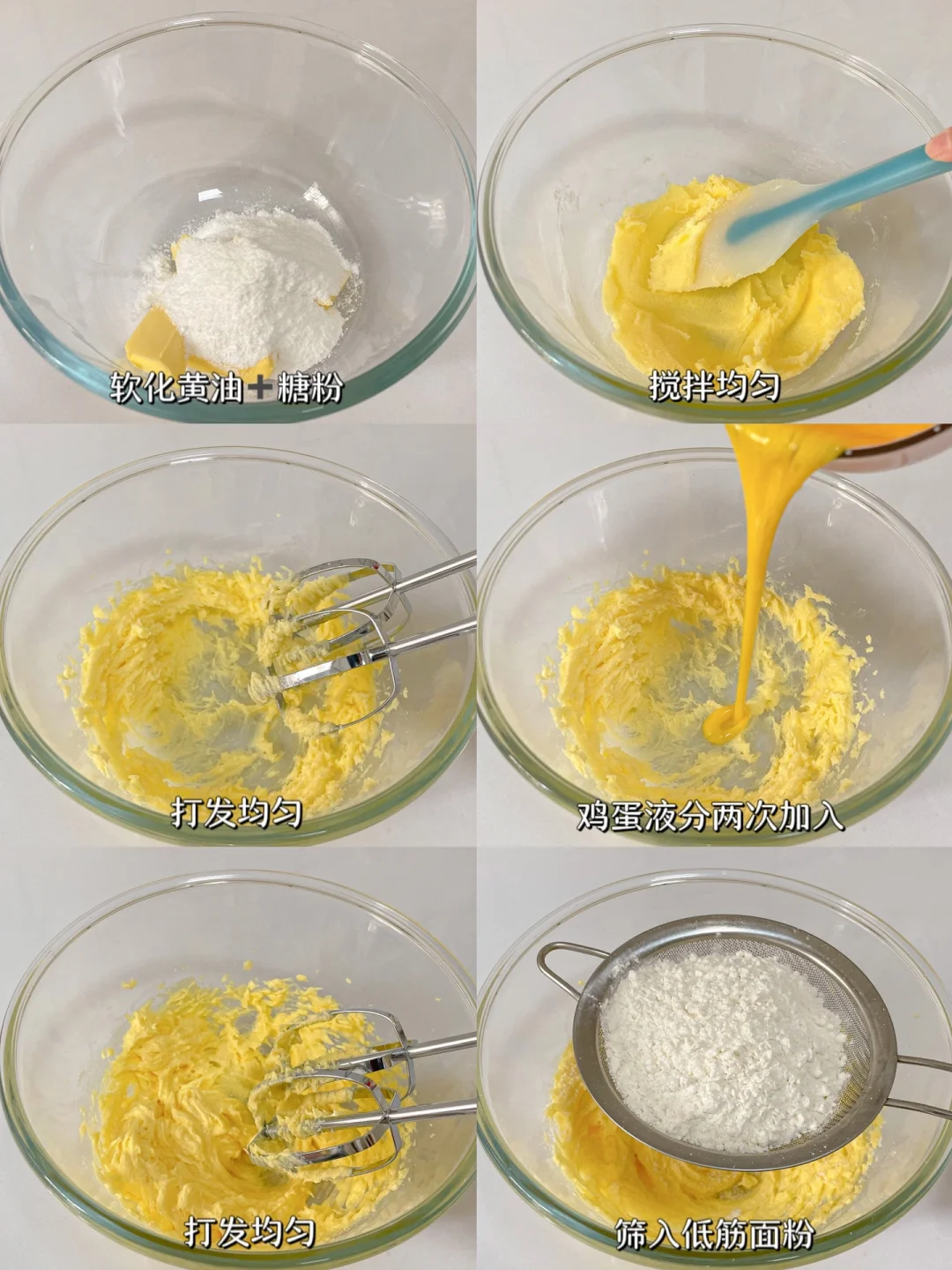 1⃣️软化黄油+糖粉搅匀后打发均匀,鸡蛋液分两次加入打发均匀,筛入低筋面粉混合揉成团。