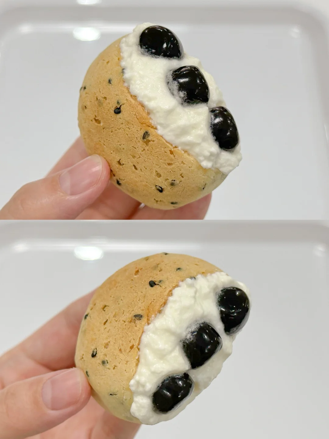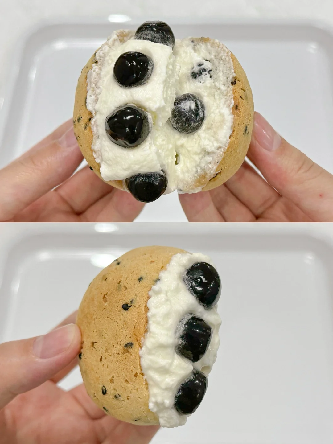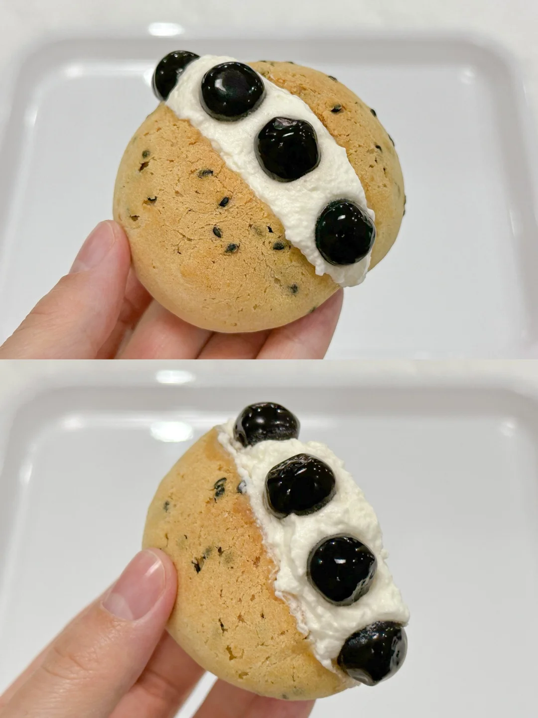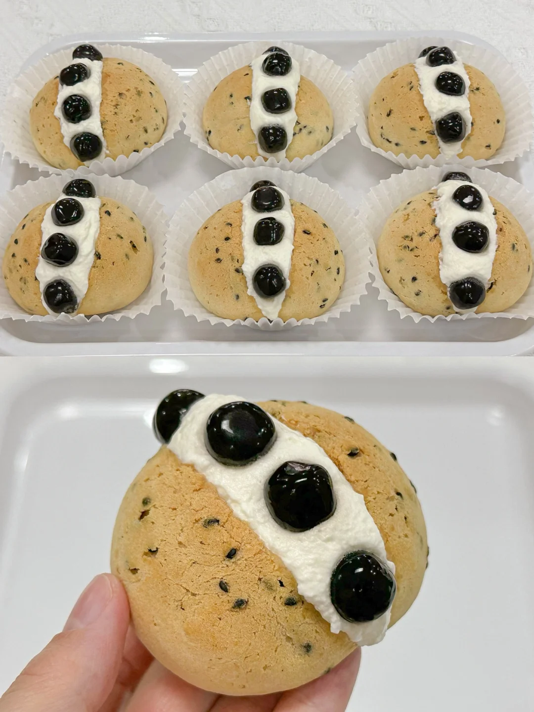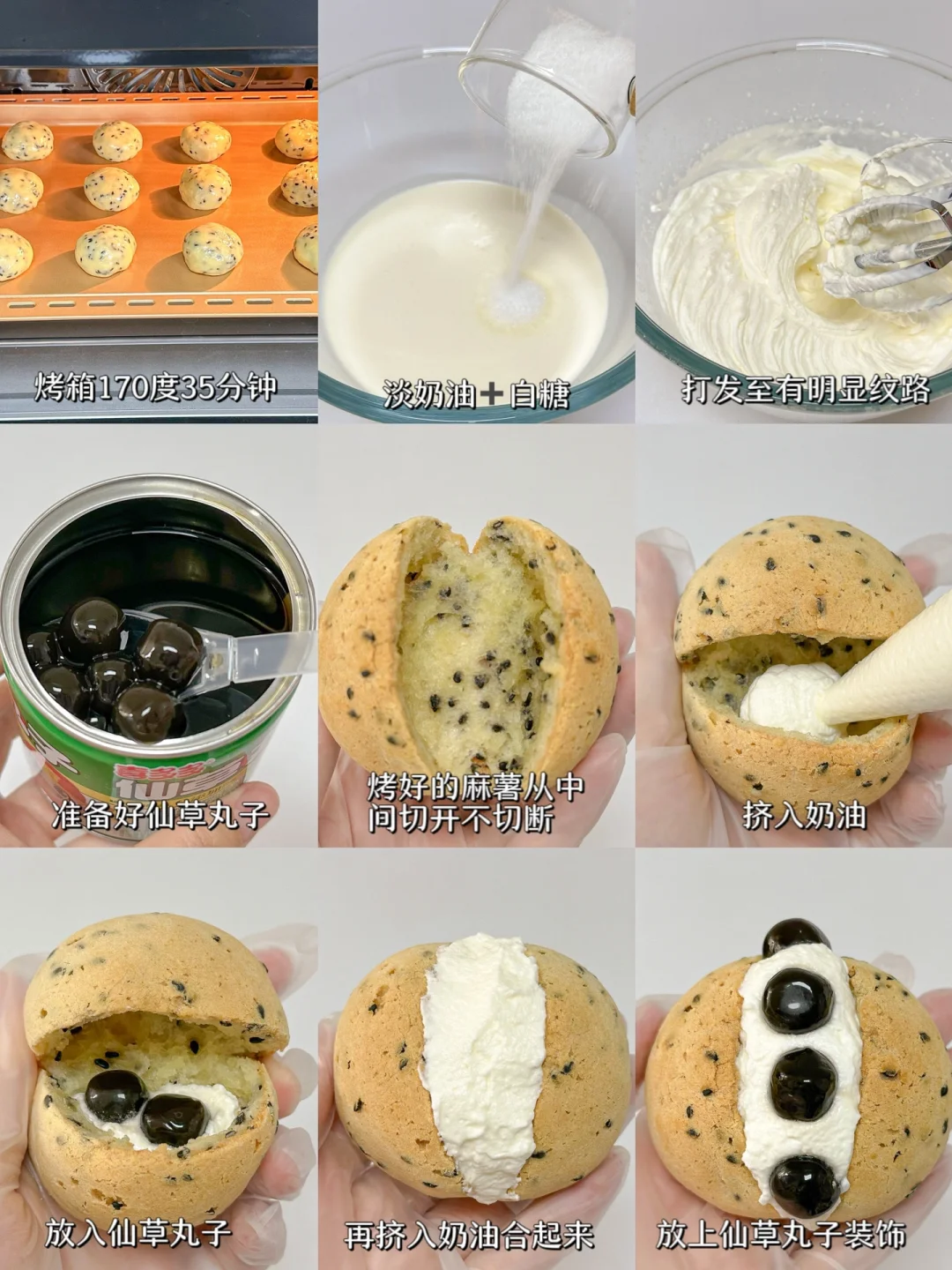 3⃣️淡奶油+白糖打发至有明显纹路装入裱花袋中,准备好仙草丸子,晾凉的麻薯包从中间切开不切断,挤入奶油,放入仙草丸子,再挤满奶油合起来,中间稍微抹平整,再放上仙草丸子装饰即可开吃。