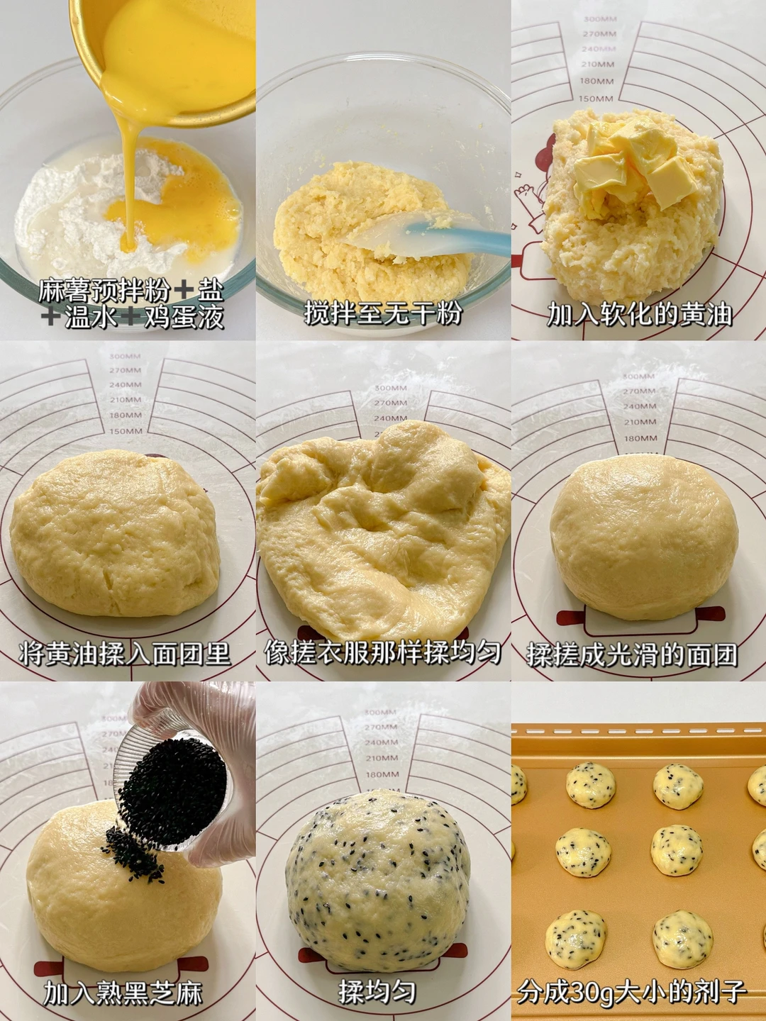 1⃣️麻薯预拌粉+盐+温水+鸡蛋液混合搅拌至无干粉,放在揉面垫上加入软化黄油,将其揉入面团里,然后像搓衣服那样揉均匀,揉搓成光滑的面团(大概5分钟左右),加熟黑芝麻揉均匀。