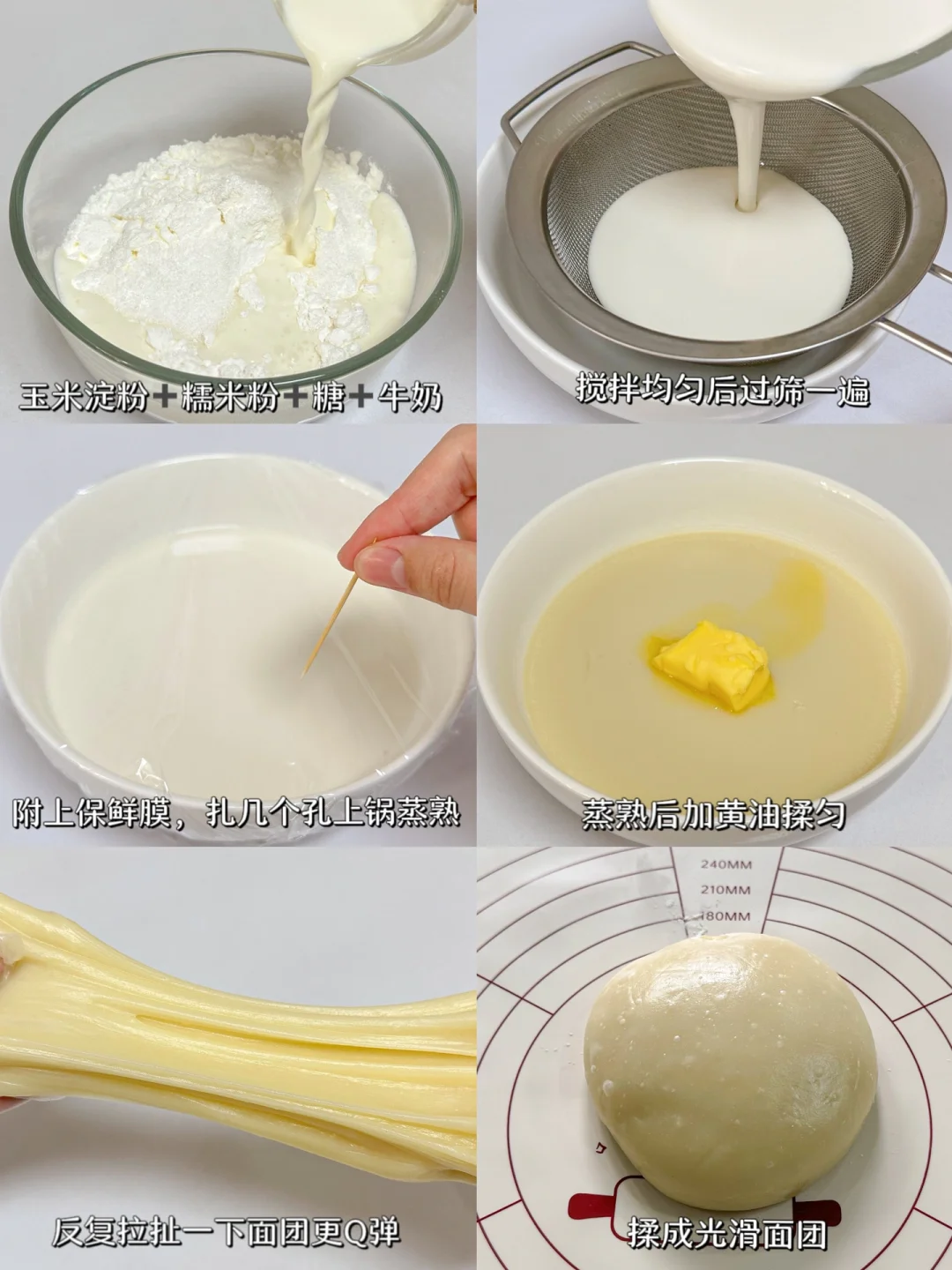 2⃣️玉米淀粉+糯米粉+白糖+牛奶搅拌均匀,过筛一遍,附上保鲜膜,扎几个小孔上锅蒸熟,蒸熟后加入黄油揉匀,反复拉扯一下面团更Q弹,整理成光滑的面团。