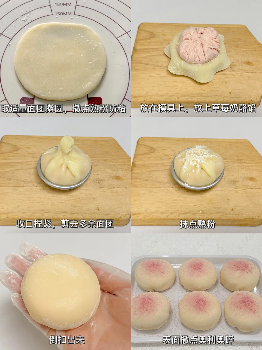 3⃣️将面团分成40g大小擀圆,撒点熟糯米粉防粘,放在模具上,放上草莓奶酪馅,收口捏紧,剪去多余面团,抹点熟粉防粘,表面撒点奥利奥碎即可。
