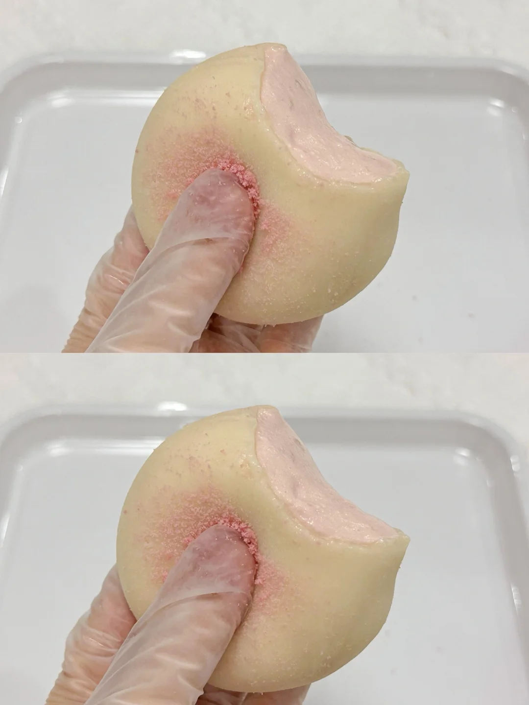1⃣️软化的奶油奶酪+白糖拌匀,倒入淡奶油和草莓酱打发均匀,装入裱花袋中,挤在保鲜膜中,分成50g一个,冰箱冷冻凝固。