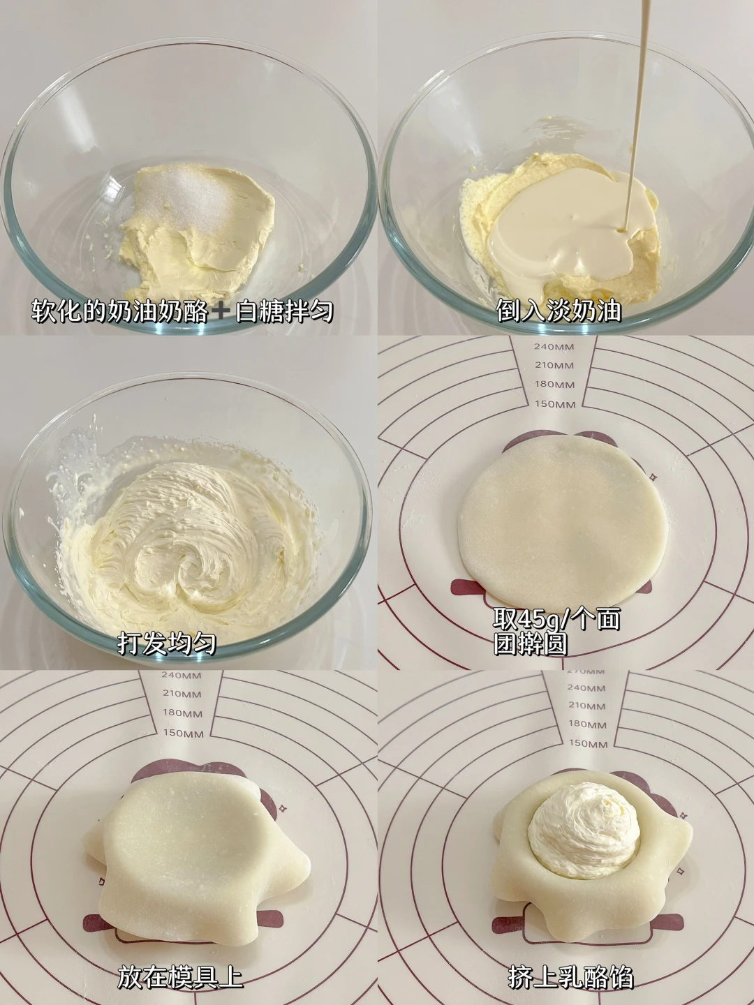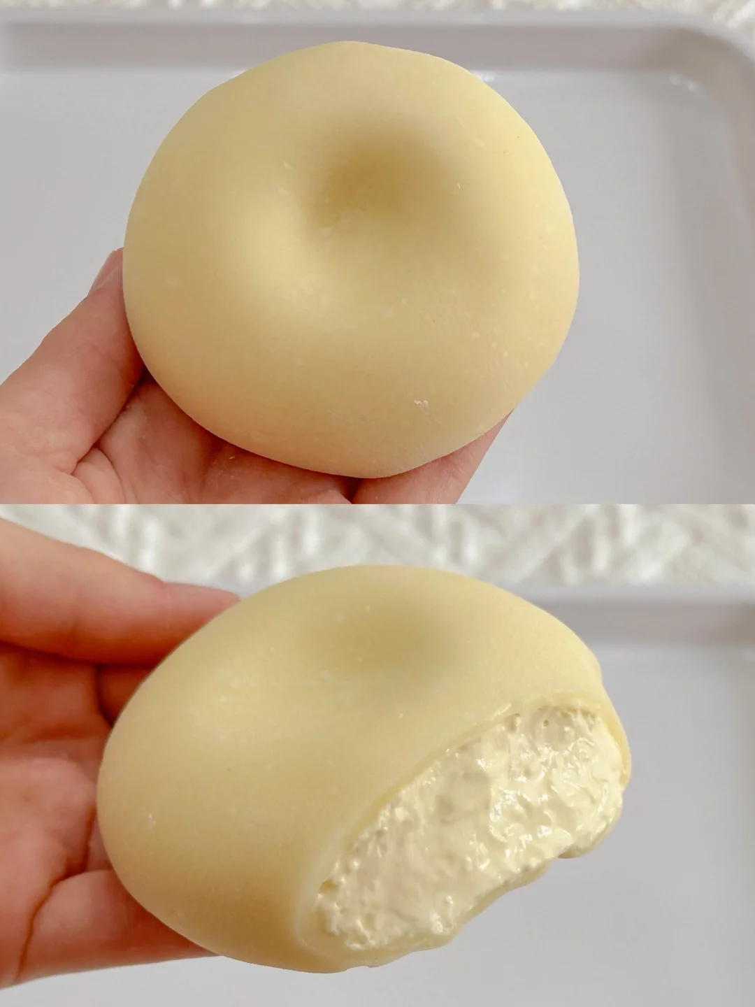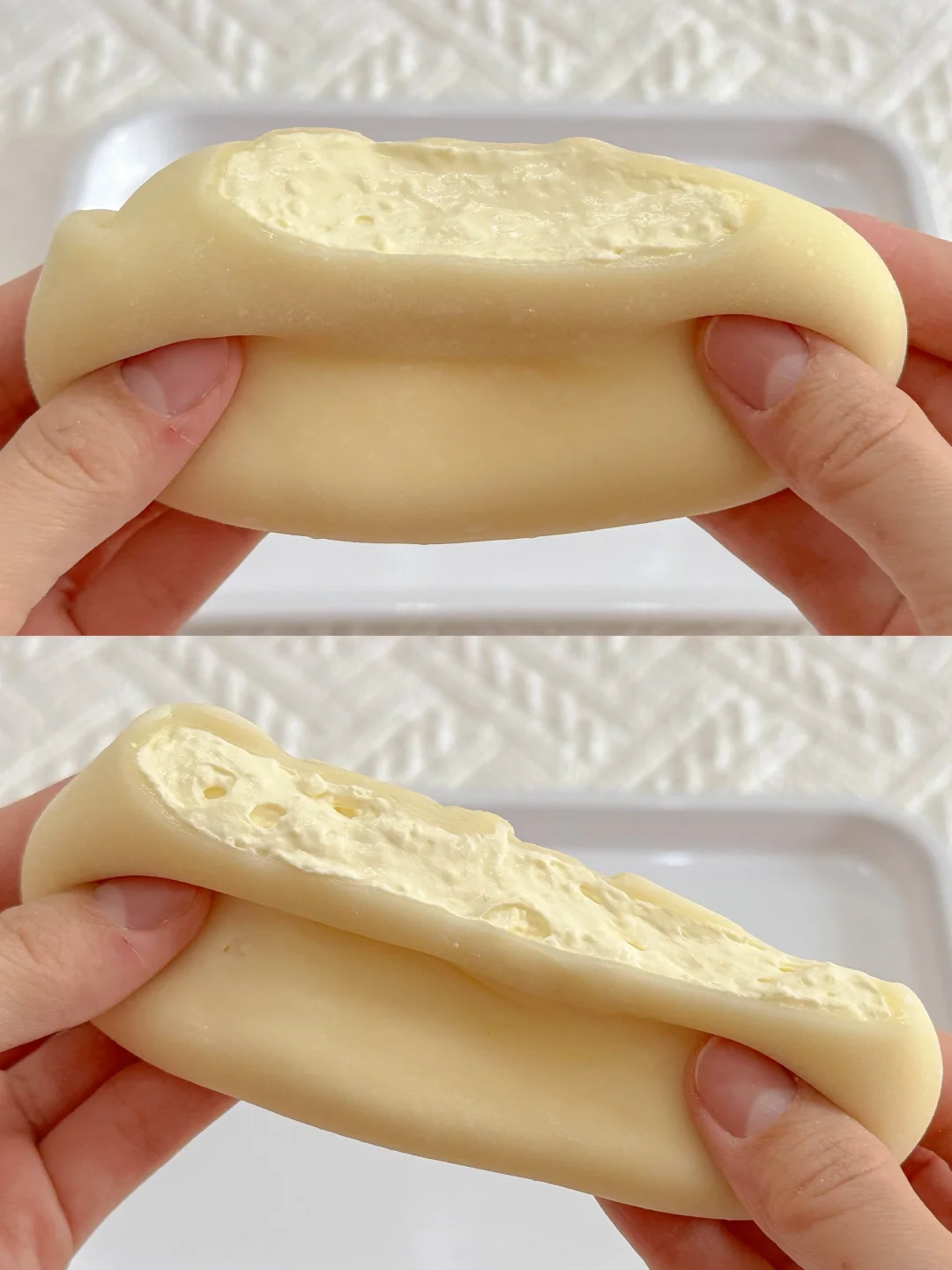 4️⃣取适量45g/个面团,擀成圆形,将乳酪馅挤在面团上,收口包紧,剪去多余的面团,抹上熟粉防粘,倒扣出来装盘后中间压一个小窝即可。