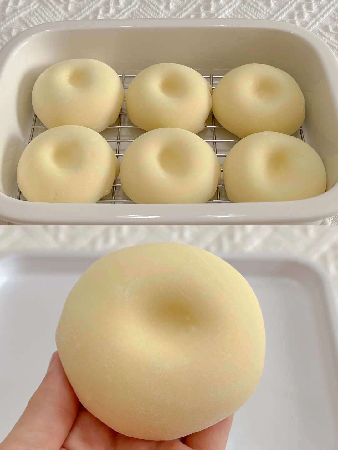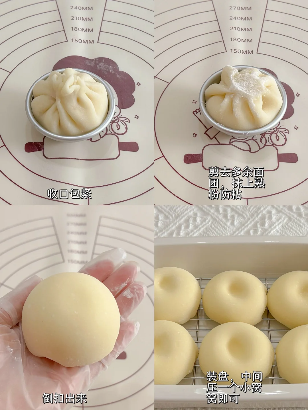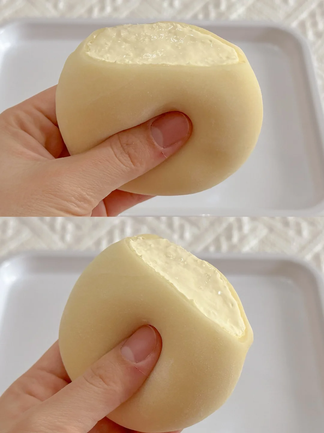 4️⃣取适量45g/个面团,擀成圆形,将乳酪馅挤在面团上,收口包紧,剪去多余的面团,抹上熟粉防粘,倒扣出来装盘后中间压一个小窝即可。