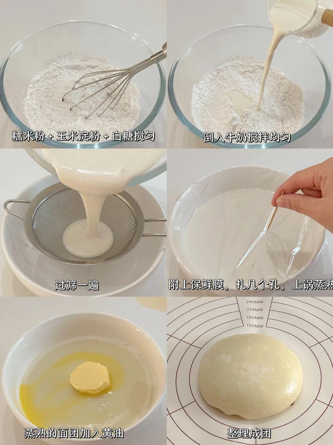 1️⃣将糯米粉、玉米淀粉和白糖混合均匀,倒入牛奶,搅拌均匀,过筛一遍,附上保鲜膜,扎几个孔,上锅蒸25分钟左右。