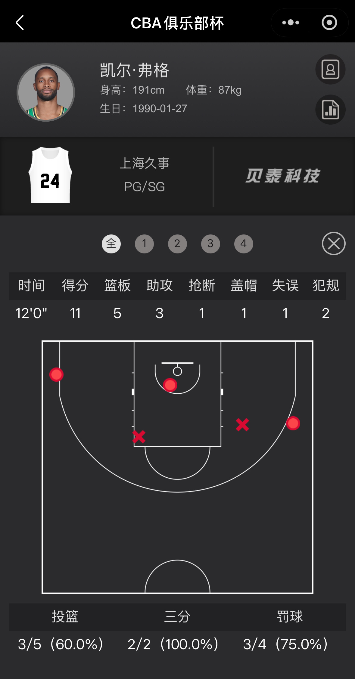 插播杯赛今日上海战胜宁波弗格依旧高效,出场12分钟得到11分5篮板3助攻1抢断1