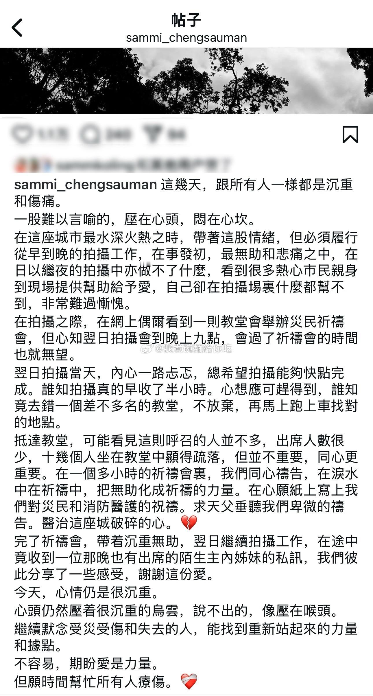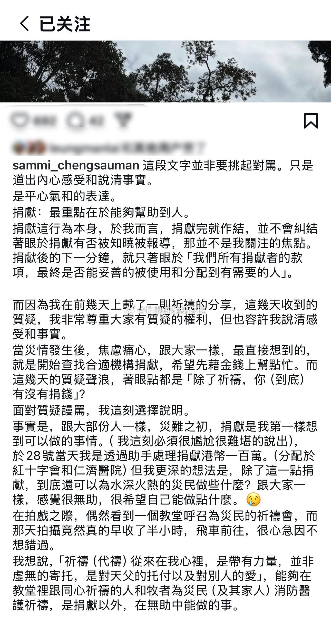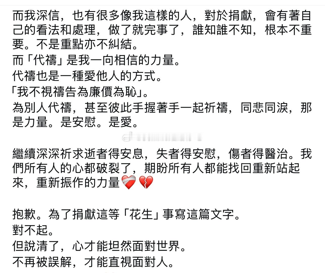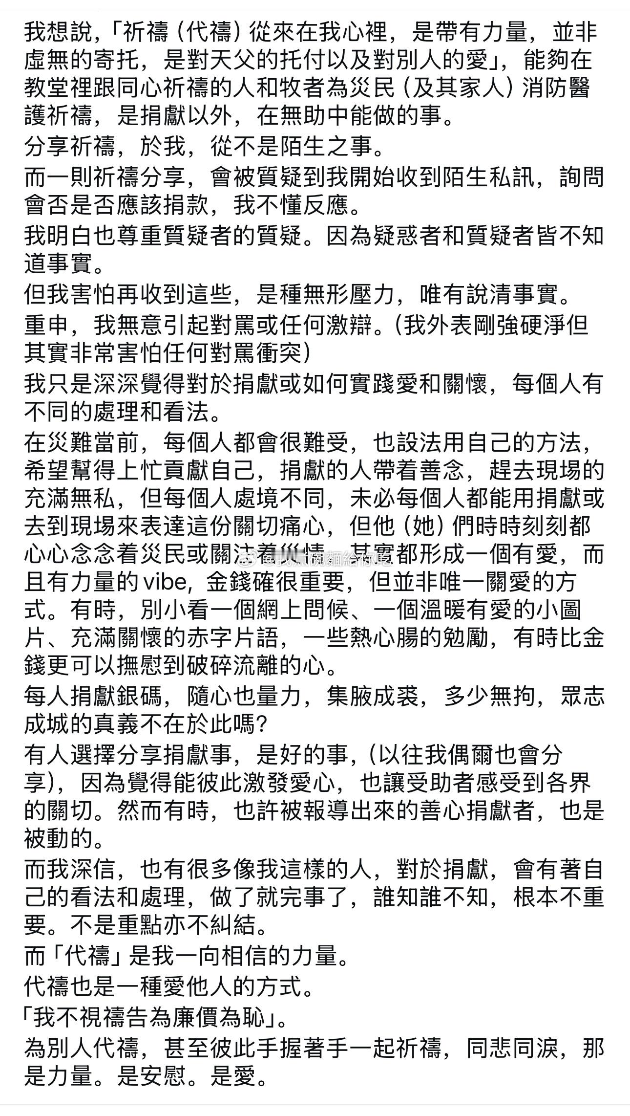 郑秀文被质疑「只祈祷没捐钱」:已捐出100万.大埔宏福苑火灾,郑秀文前几天上载了一则祈祷的分享,不过却收到网民质疑,针对她在灾情发生后「除了祈祷,到底有没有捐钱」的质疑和谩骂。郑秀文今天再发长文,指「非常尊重大家有质疑的权利」,但请容许她说清感受和事实。郑秀文指外界的着眼点都是「除了祈祷,你(到底)有没有捐钱」?她形容这让她感到「尴尬很难堪」,并害怕再收到这类询问她是否应该捐款的私讯,这形成了一种「无形压力」。郑秀文表示在11月28号,已透过助手处理,捐献了港币一百万,并分配给红十字会和仁济医院。郑秀文还表示,对于她来说,捐献的重点是「能够帮助到人」,一旦捐献完毕就作结,并不会纠结于是否被知晓或报道,唯一关注的焦点是「款项最终是否能妥善的被使用和分配到有需要的人」。她最后呼吁,对于如何实践爱和关怀,每个人有不同的处理和看法。金钱虽然重要,但并非唯一方式。有时,一个网上问候、一句温暖有爱的片语,比金钱更能「抚慰到破碎流离的心」。
