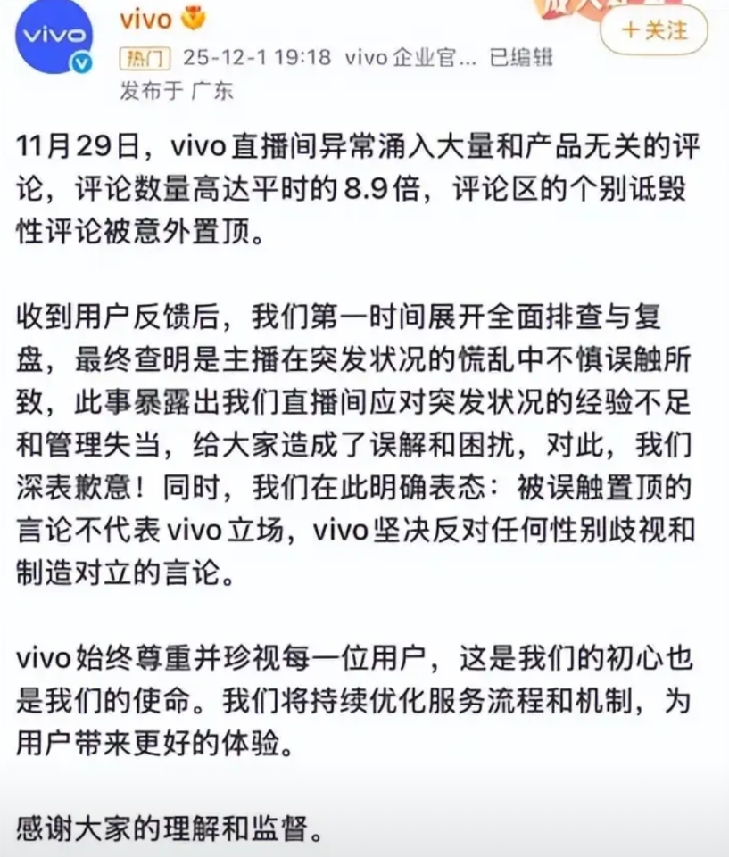 这两天刷微博看到很多人在说VIVO直播间事件,查了一下才发现,原来是因为VIVO直播间,主播不小心把一条“不需要女用户哦、购买力太差了”的评论置顶了,结果导致一时直播间评论是平常的8.9倍,这么明显的性别歧视被骂是很正常的,关键是ViVO的用户本来就是女性占比更高,评论区被骂的人多,流量肯定会越大。