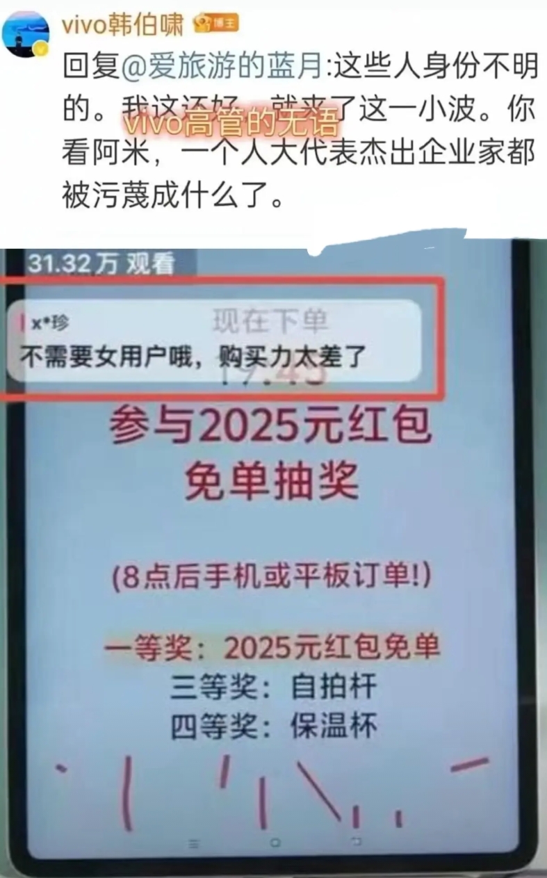 然而VIVO高管韩伯啸发文称,这些不明身份的,我这还好,就来了一小波,你看阿米,一个人大代表企业家都被污蔑成什么样了。