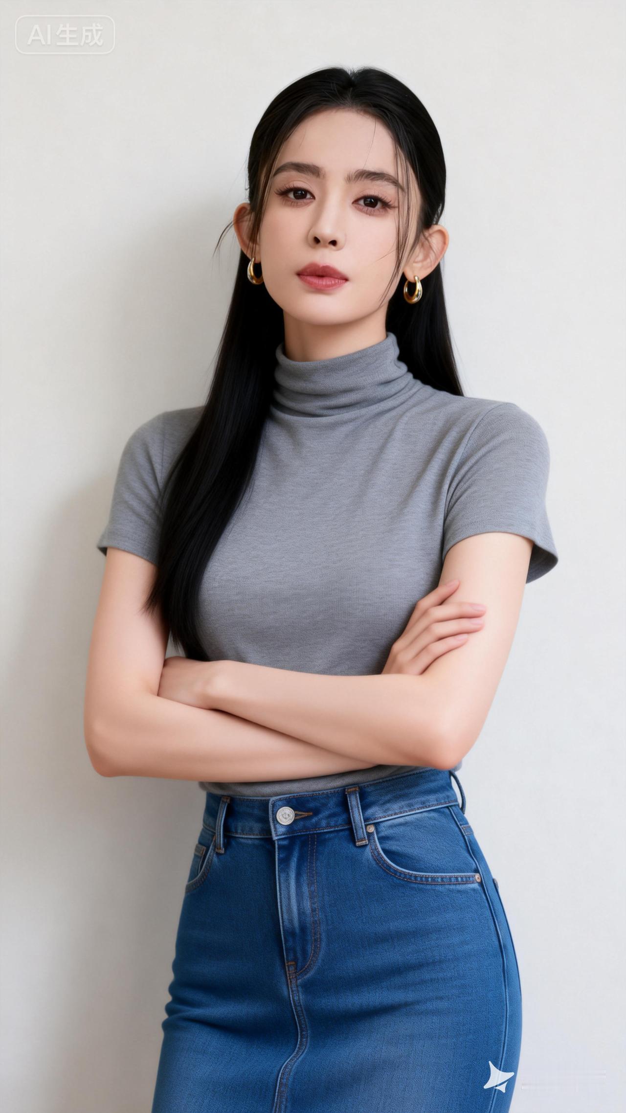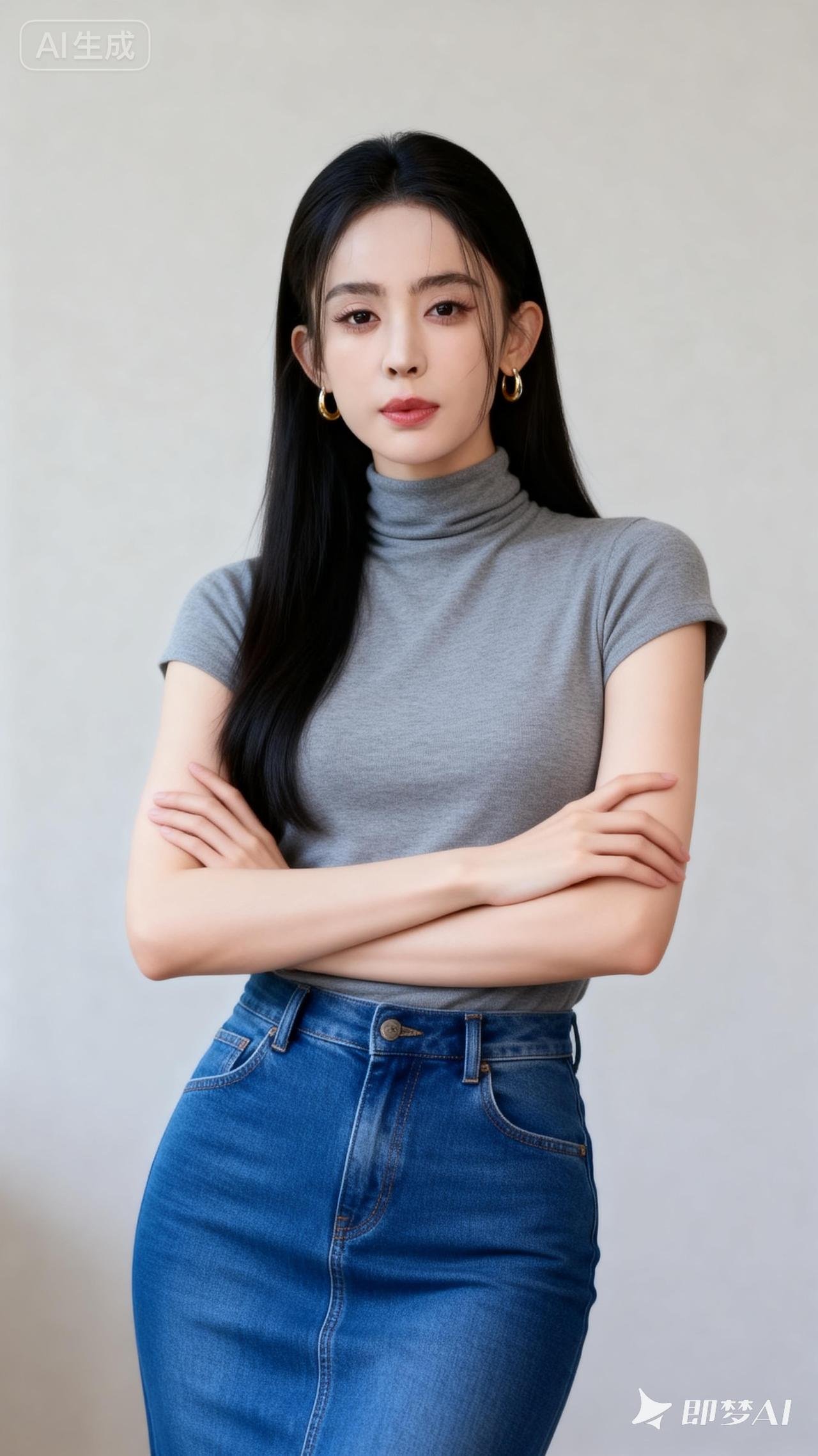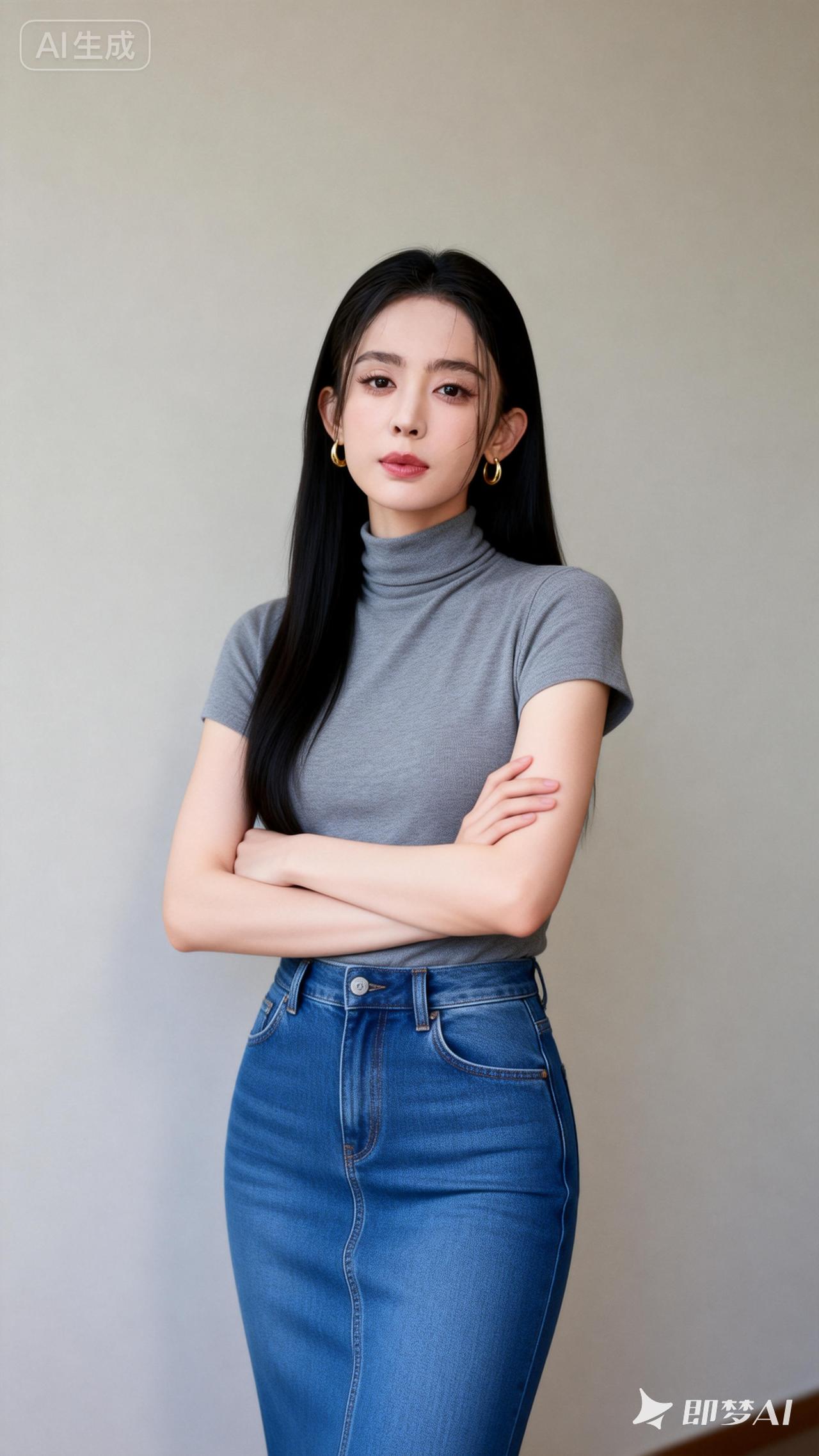 简约时尚穿搭,灰色高领衫搭配蓝色牛仔裤,尽显优雅气质。