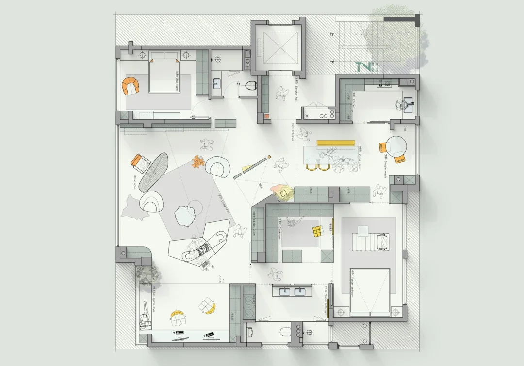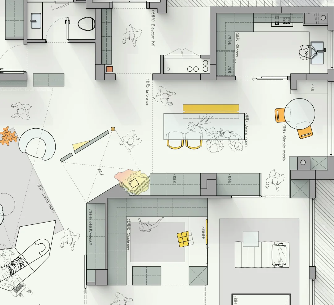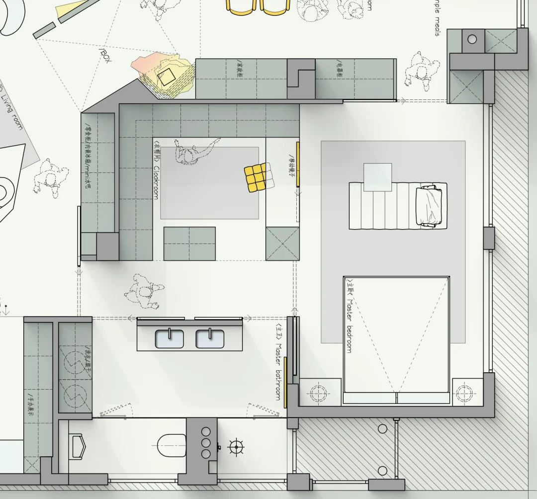 设计需求: 00后夫妻 1、未来三年内打算要一个小孩 2、希望厨房配套齐全,偶尔下厨,厨房需要考虑封闭,开通煤气需要 3、女业主衣服鞋子多 4、男业主要电竞房 5、家庭需要临时办公,喜欢看电影 6、家政间可有可无,但家政柜要充足,晾晒可有可无
