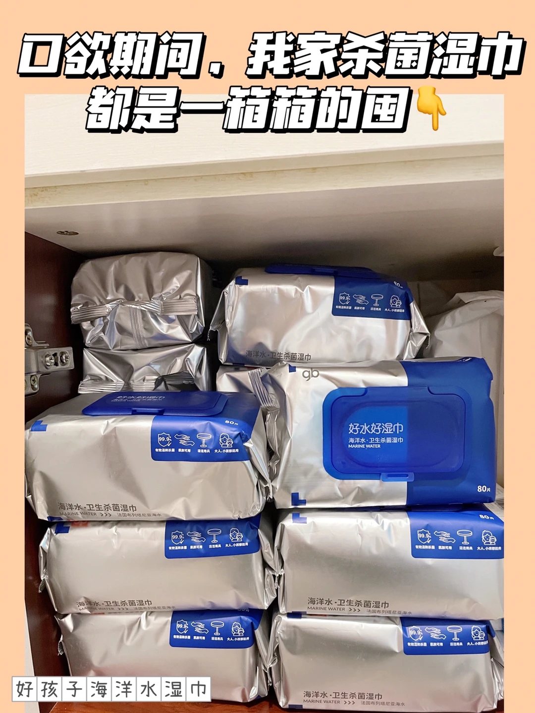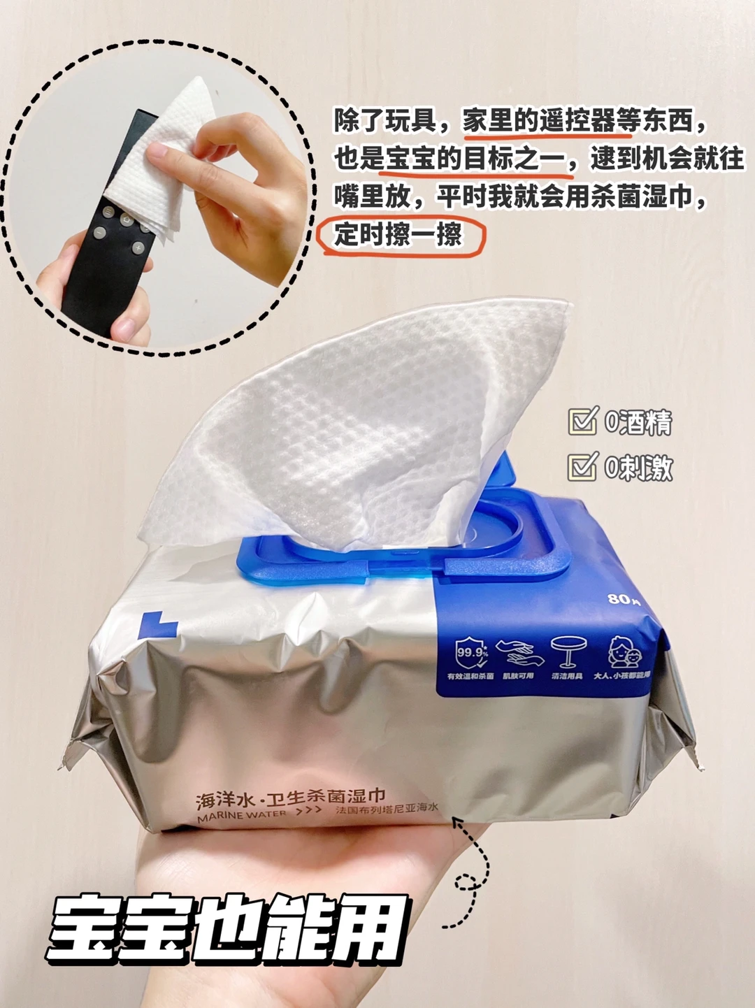 🔹因为不可避免的会和宝宝有接触,我使用会比较谨慎。家里现在用的是▪️好孩子海洋水湿巾,也是很偶然发现的,它不含酒精但是杀菌功效却一点也不打折,相比刺激的酒精湿巾,0酒精的杀菌湿巾会更温和安全,对宝宝的皮肤也会更友好。