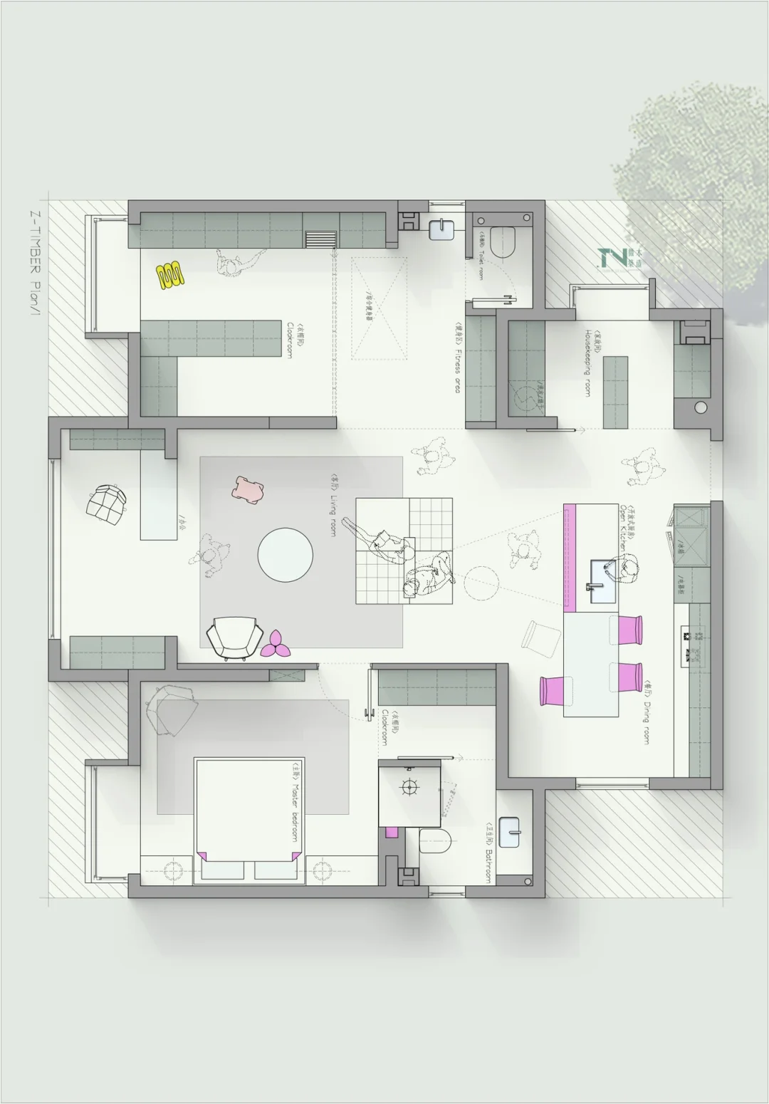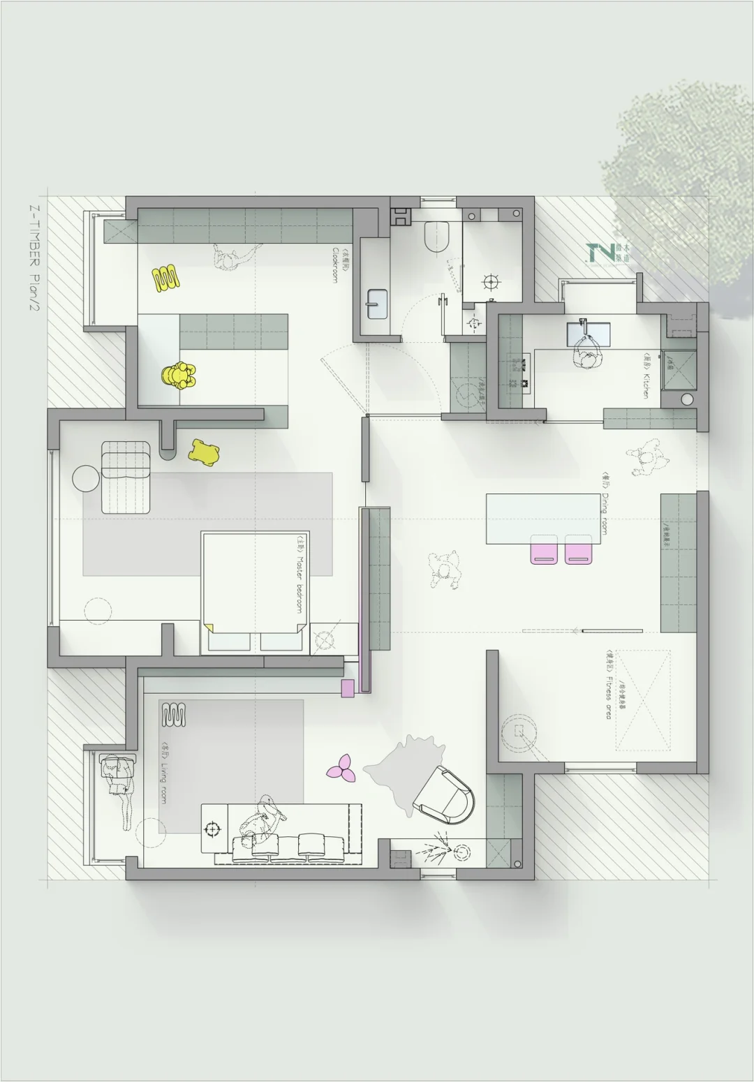 三居室改一居室 设计要求: 单身贵族 1、只需要一个卧室、一个卫生间,需要独立衣帽间 2、一个健身区域,能放下1~2台器械,一个单杆。 3、平时一个人简餐多偶尔聚餐6人,要西厨需要放下基本电器 4、客房可有可无。 5、客厅不要电视预留投影仪,书桌,飘窗能拆, 6、家政间 户型结构不知道怎么设计好,希望可以有创意的设计