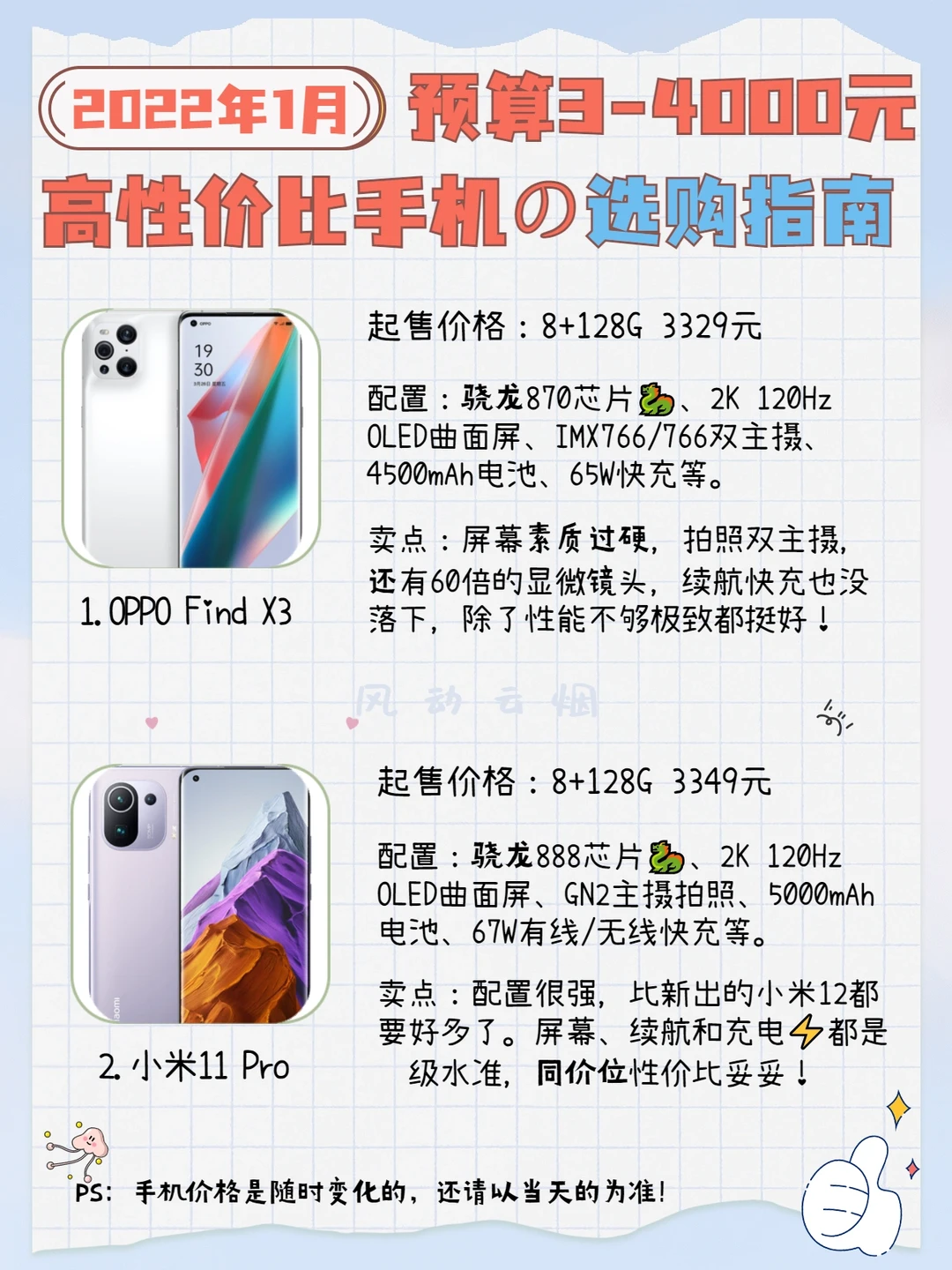2022年手机推荐第四弹来啦🌪,本期推荐的高性价比手机一共有6⃣️款,它们分别是: 1⃣️OPPO Find X3:3329元💰起售; 2⃣️小米11Pro:3349元💰起售; 3⃣