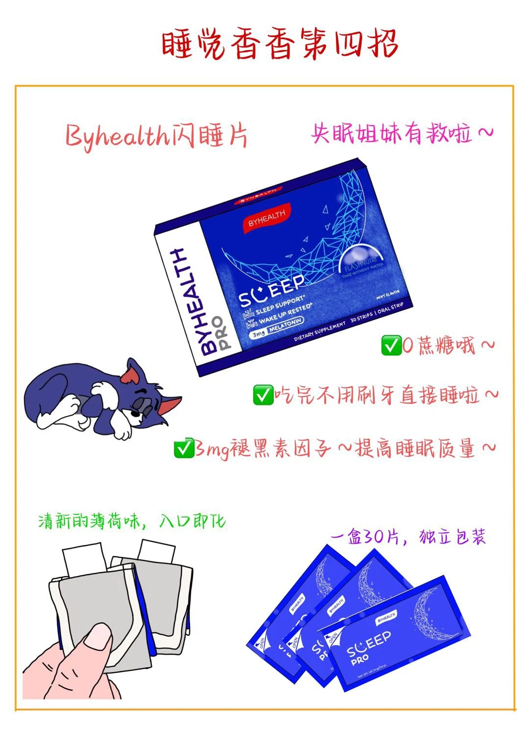 🍀第四招:补充褪黑素。小橙子🍊做了好多功课,入手了Byhealth闪睡片来帮助睡眠。这款是含3mg褪黑素的薄片,不含糖,清新的薄荷味,入口即化。吃完也不用刷牙啥的,睡前含一片,睡觉香香的[赞R]是失眠党的救🌟吖,让你晚上少数几只🐑入睡[偷笑R]