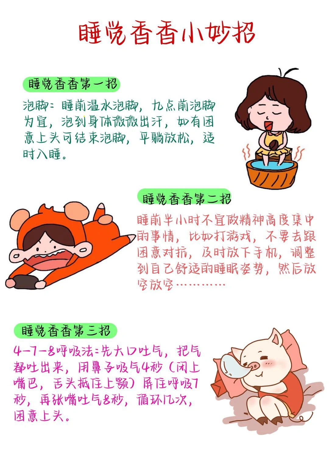 🍀第一招:睡前温水泡脚,九点前泡脚为宜,泡到身体微微出汗,如有困意,结束泡脚,平躺放松,适时入睡。