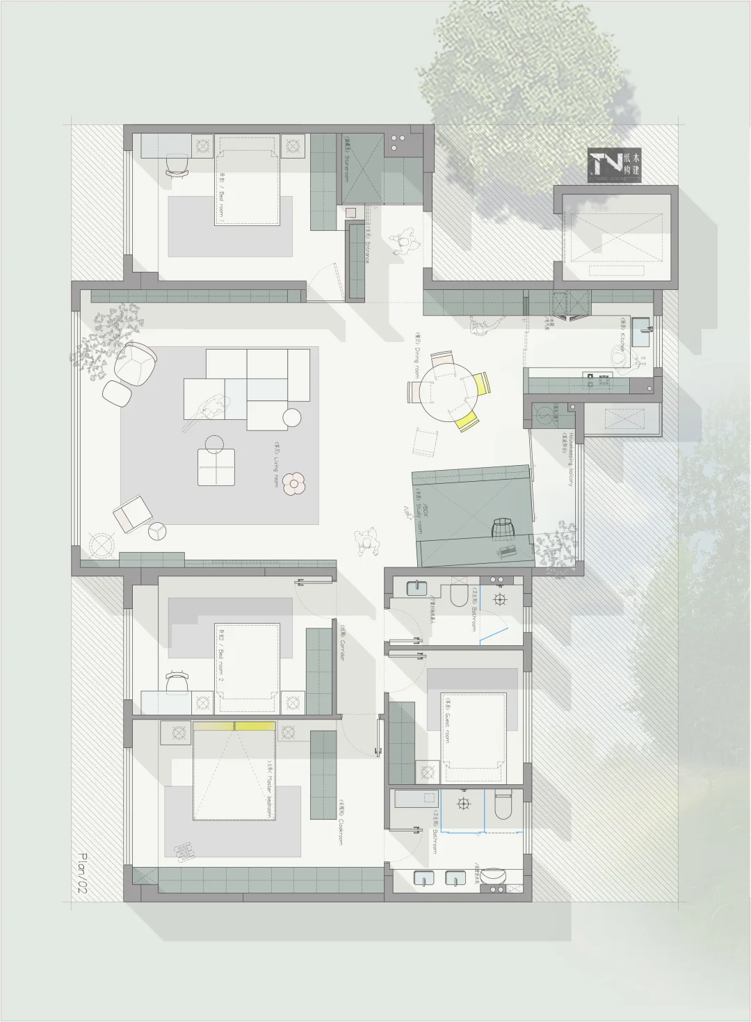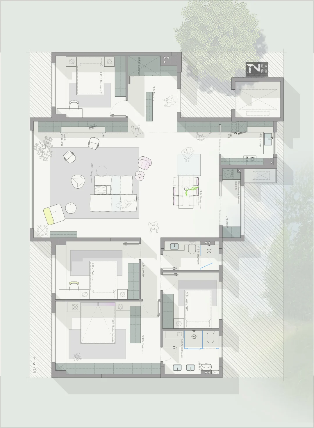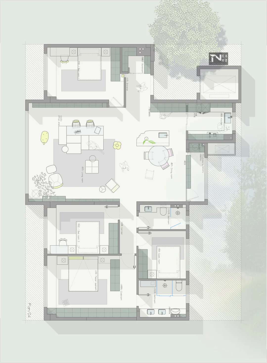 设计需求 一家四口 1、主卧套间 2、两个孩子房 3、客房 4、客厅加一个办公区 5、餐厅想要岛台