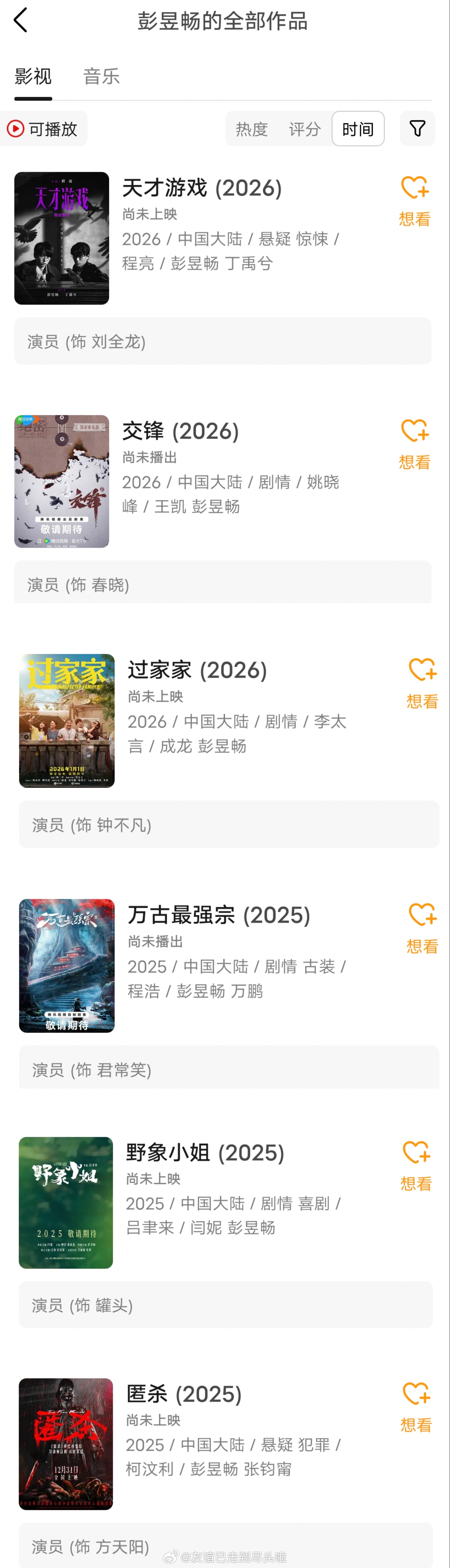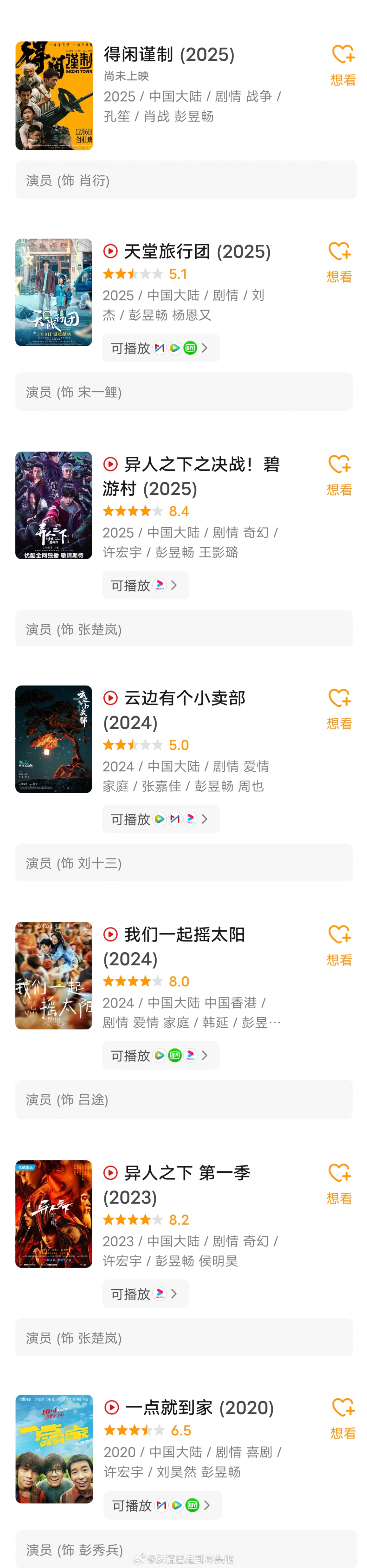 刷到粉丝说彭昱畅个体户资源差,他一直是90生里电影资源最多的吧。糊糊时期常驻国民