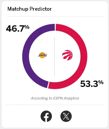 湖人明日客场挑战猛龙,卢卡因个人原因缺席比赛,湖人的胜率仅有46.7%猛龙vs湖