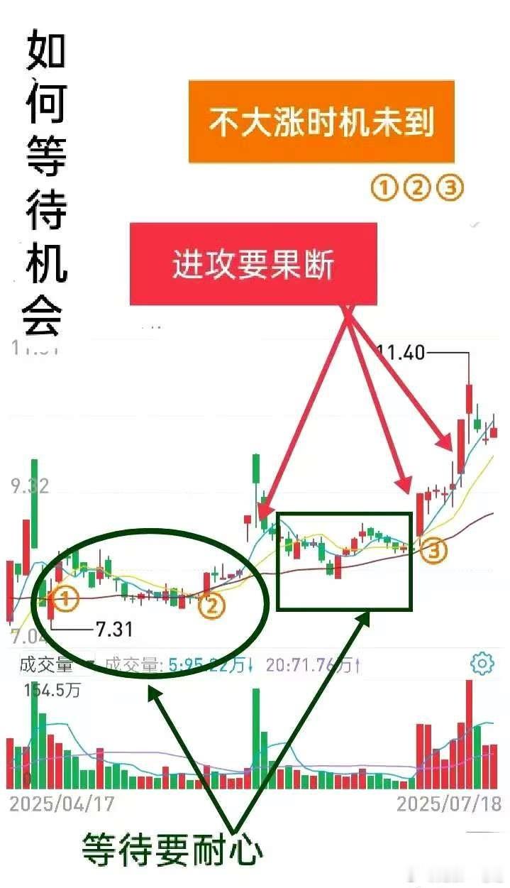 短线交易一定要有耐心,耐心地找,找到目标个股要耐心地等。个股股价在生命线上运行,一般来讲,上涨总体趋势未改变。所以,做短线一定要参考这条线,有人以为20日,这里讲30日均线,意义相近。操作中,在此线基础上把握趋势更重要。如何找机会呢?看图,第一波突破大底行情结束后,股价在生命线上运行,走势变弱。股价从高位的向下调整,这段时间需要耐心地等待。如果出现弱转强是否可以介入呢?未必。看①、②标记的点,涨幅小,股价未涨停,攻击力度不强。仍然不是买入的最佳时机。③虽然涨停,但看右图分时出现炸板,攻击力仍显弱再次进入调整。而其它两个涨停,次日都有很高的溢价,符合短线操盘。因此,我们要等待最好的机会,弱转强,而且最强,即涨停板买入。为什么做短线常常打板,这就是原因,确定性是所有K线形态中最高的。如果出现③这种情况,打板后没产生溢价进入调整,怎么办,没的说,短线是不参与调整的。通过这一案例,聪明人会悟出做短线的逻辑,然后在实战中去不断打磨。各种交易模式不同,逻辑是一样。大涨就是主力拉升出货,短线只要这一段。仅供交流,点赞评论加关注,共同进步。