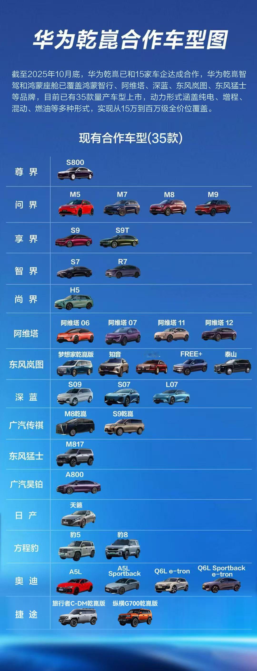 从年初的30万次到11月的509万次,能看出来大家日常开车是真离不开华为乾崑智驾的车位到车位2.0功能。作为老鸿蒙智行车主,我是离不开这功能,不管啥车位都能轻松停,日常还能缓解开车过程中的疲劳。对车企来说,自研智驾真的不划算,又费钱又耗时间,还拿不到足够的真实数据。华为车BU目前在智驾研发上的投入已超500亿,AI算力、数据、算法都顶尖,合作车企都15家了,35款车量产。2025年10月,合作品牌总销量超10万台!。截至2025年11月底,华为乾崑累计辅助驾驶里程63.8亿公里。11月期间,华为乾崑辅助驾驶累计行驶5.6亿公里,相当于绕地球1.4万圈,主动避免可能的碰撞26万次。这口碑无论是行业内还是用户心中都是首选的存在。企业愿意合作,用户愿意选,这波双赢!买车就买乾崑智驾华为乾崑智驾数据月报