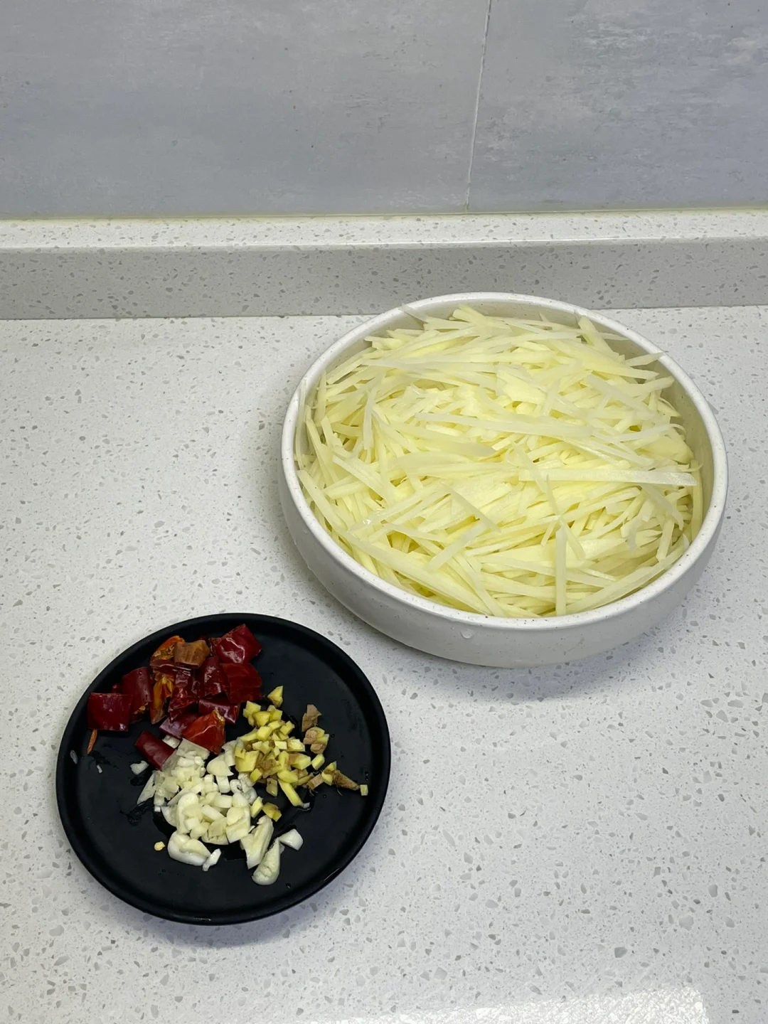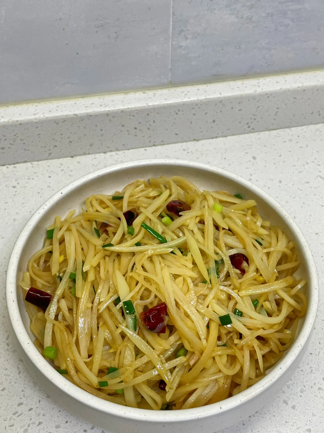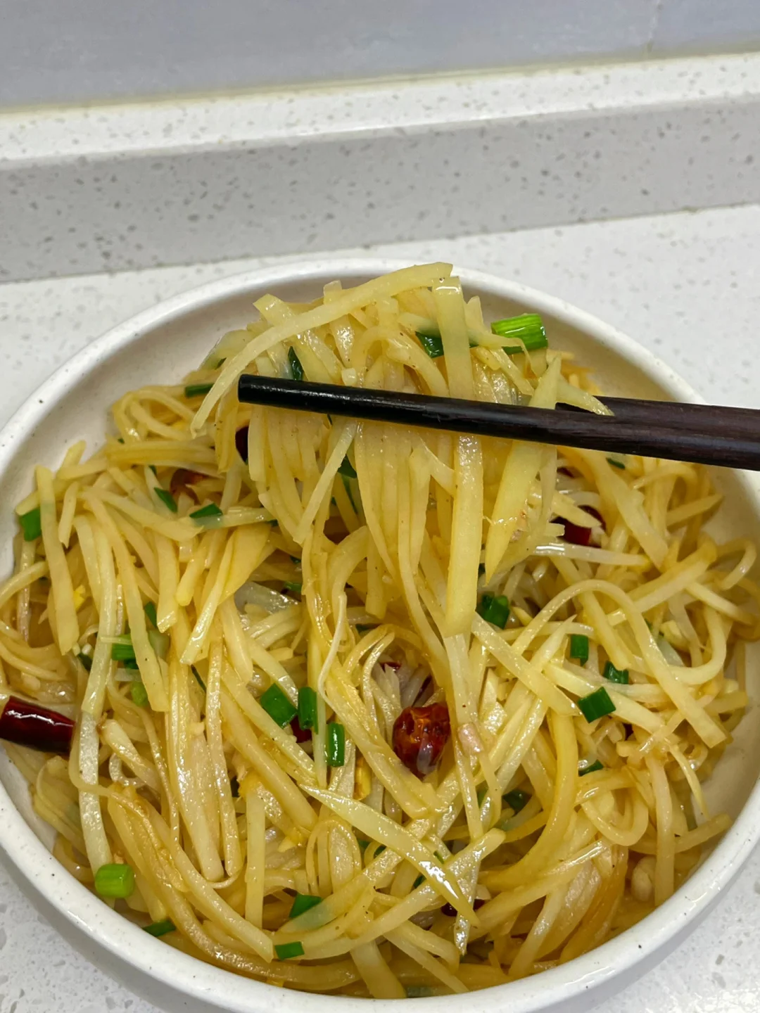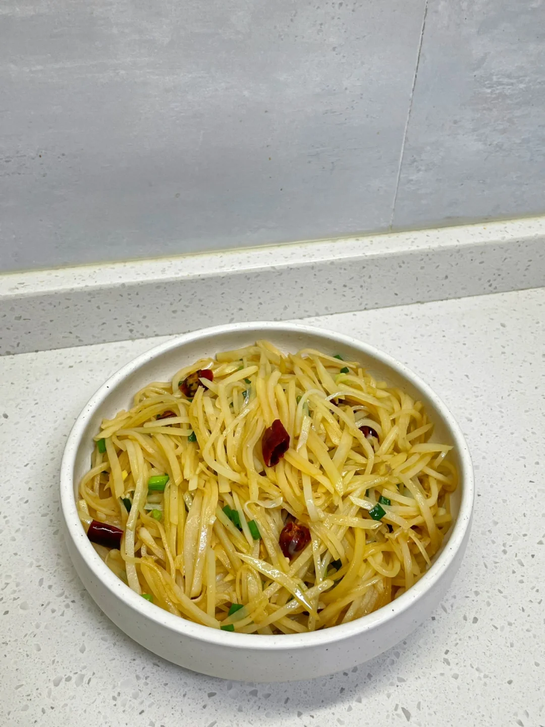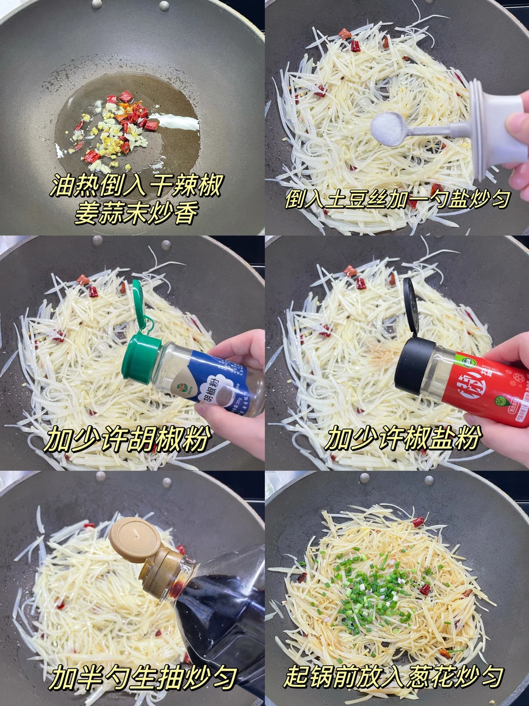 土豆yyds,夏日炎炎不想吃肉的时候,来上一份炒土豆丝也太爽了~ 食材:土豆 配料:姜蒜末 干辣椒 葱花 盐 胡椒粉 椒盐粉 生抽 1⃣️:土豆去皮切成细丝洗去多余淀粉后沥干水分,准备好配料 2⃣️:锅中油热倒入干辣椒,姜蒜末炒香,倒入土豆丝加一勺盐炒断生,家少许胡椒粉和椒盐粉,加半勺生抽炒匀,出锅前加葱花炒匀即可