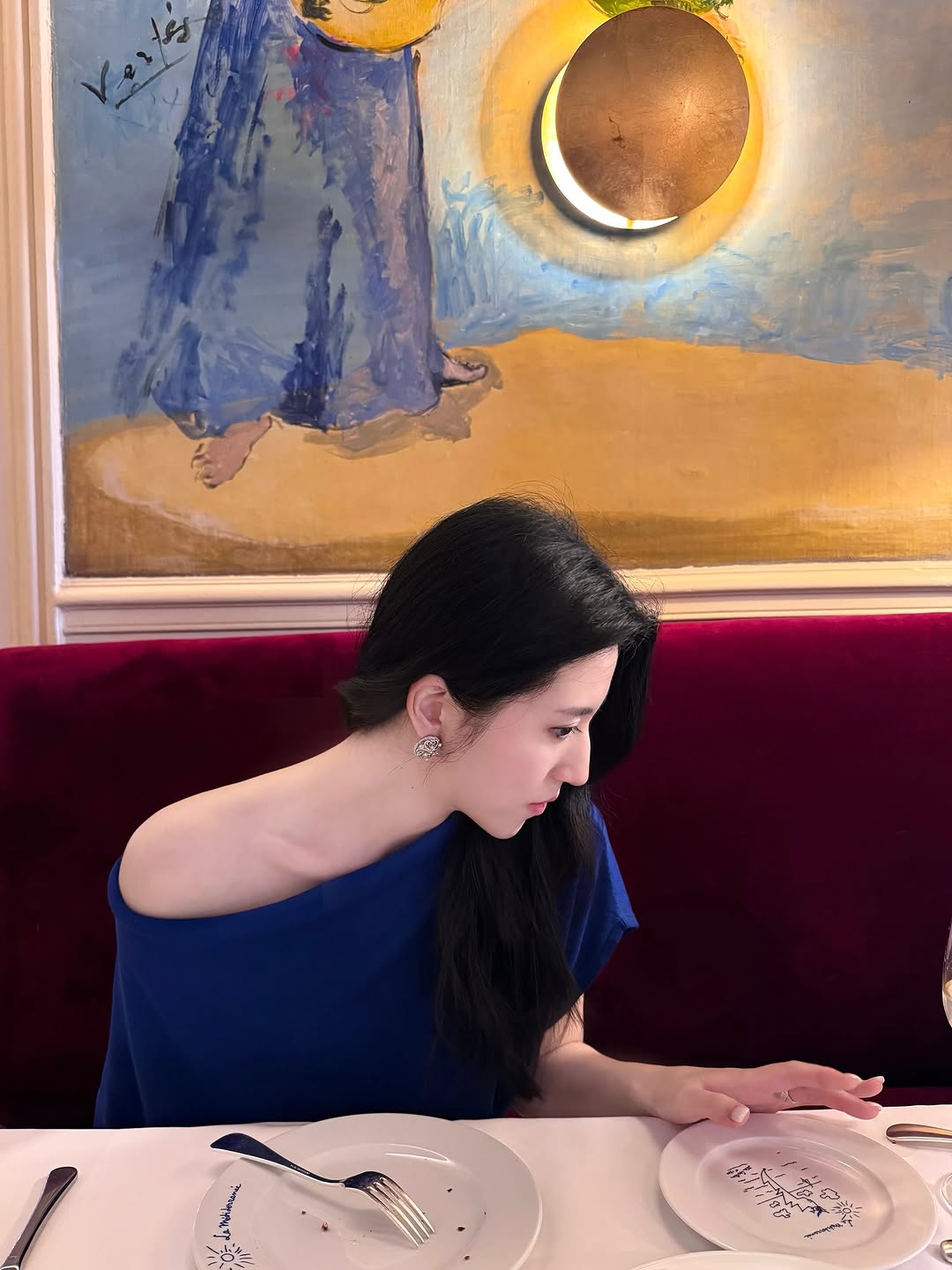 在巴黎街头,蓝衣女子漫步,优雅迷人。淑女