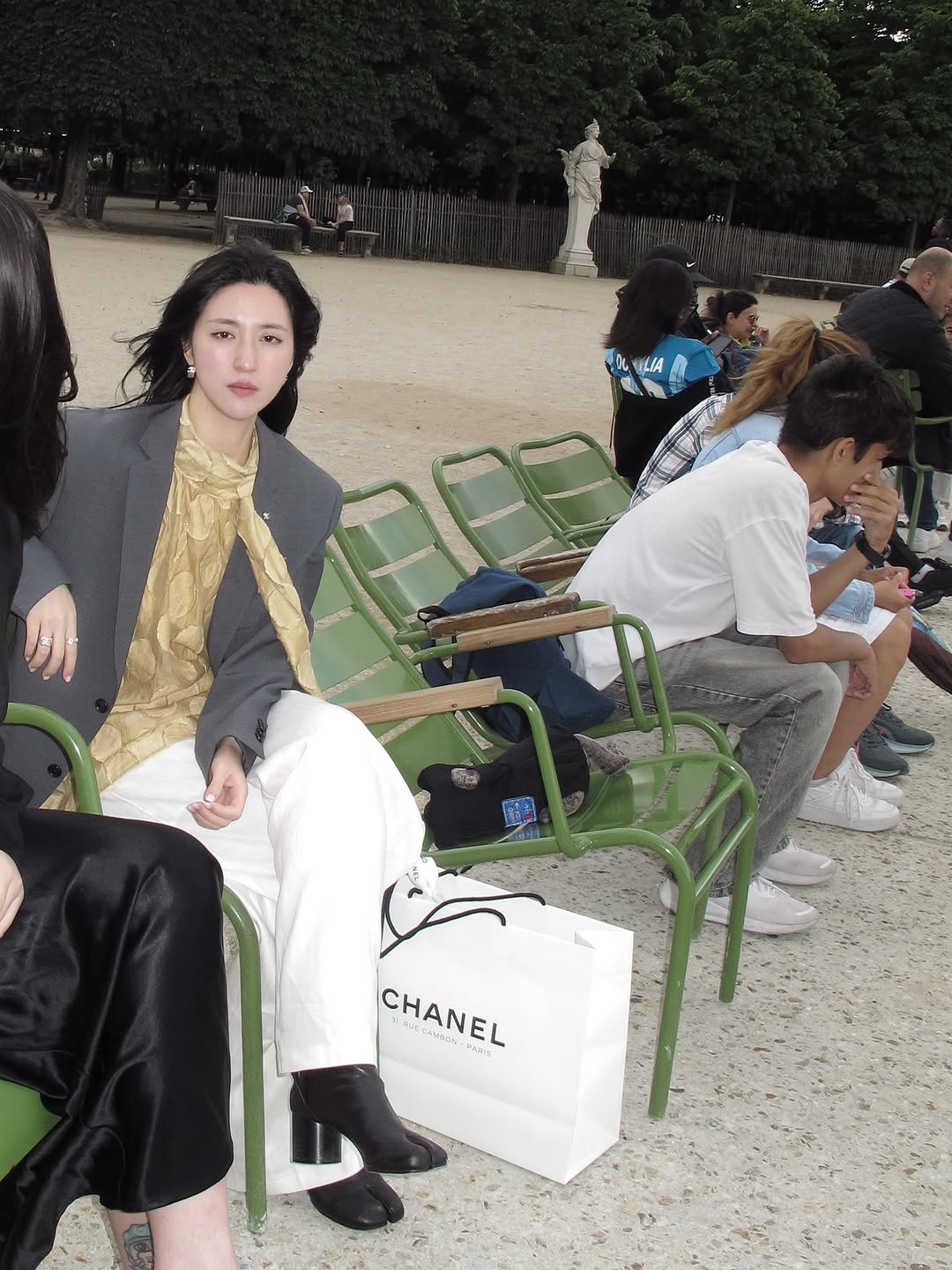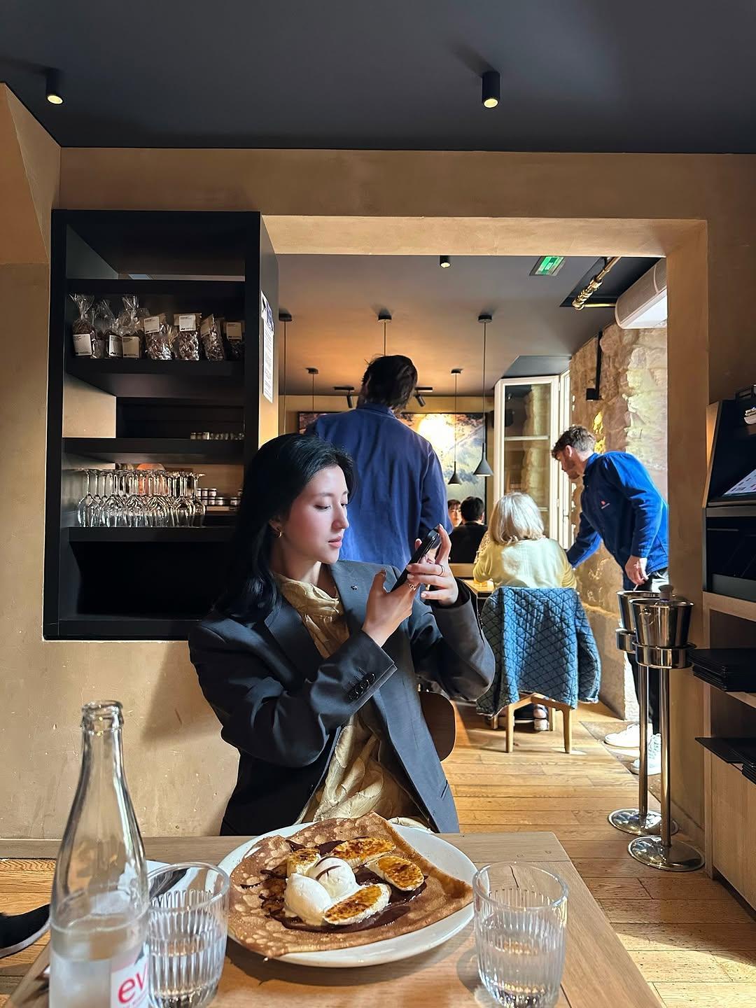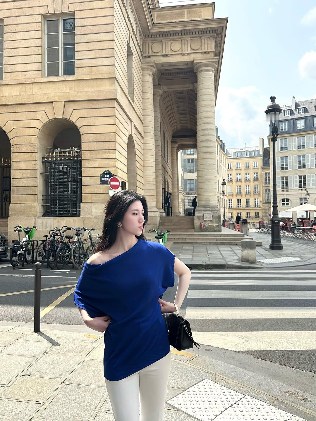 在巴黎街头,蓝衣女子漫步,优雅迷人。