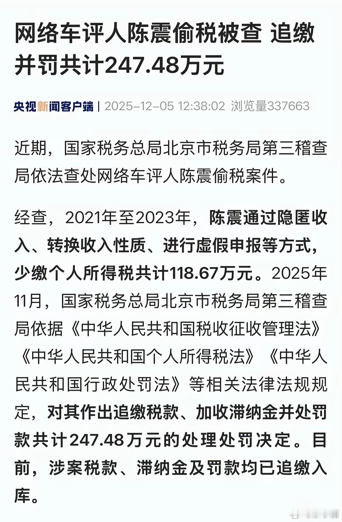 陈震名下公司因欠税被公告坐拥千万粉丝、年入超2000万却用空壳工作室偷逃税款,一边豪车加身,一边虚报收入,最终落得补税罚款247万的下场——这既是对“网红偷税必被查”的再次印证,更警示所有高收入者:法律红线碰不得,依法纳税才是唯一正道!热点观点