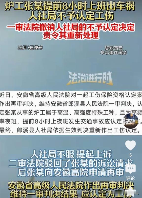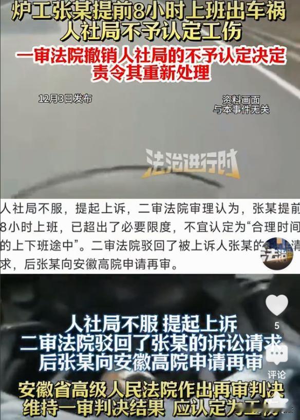 安徽宣城,张某在公司做炉工,工作是晚10点半到次日8点。他住处距公司42公里,为兼顾家庭,每天下班回家,下午再去公司宿舍休息。他骑摩托去上班途中与轿车相撞,对方全责,张某申请工伤认定,人社局不予认定。张某不服起诉,一审法院支持他,人社局上诉,二审支持人社局,张某申请再审。 张某,在一家公司当炉工,这工作又热又累,但为了多挣钱,他从2012年就坚持干着。 公司有宿舍和餐厅,可他家离公司42公里远,他晚上10点半上班,为了能照顾家里,他每天下班回家,下午再回公司宿舍。 张某一直兢兢业业,炉工的工作环境差,温度高,工作强度大,但他从未抱怨过。 他心里想着,多挣点钱,让家里人过得更好,每天下班后,他顾不上休息,就骑着摩托车往家赶。 到家后,他帮着妻子做点家务,陪孩子玩一会,虽然时间短暂,但他很珍惜。 到了下午,他又得匆匆忙忙地收拾东西,准备回公司宿舍。 他每次骑摩托车回公司的路上,他都很小心,毕竟路途遥远,而且路上车流量也不小。 2023年5月3日这天,张某下午2点13分就骑上摩托车出发去公司,他盘算着,提前一点到宿舍,还能休息一会,可意外就在这时发生了。 当他骑到一个路口时,一辆轿车突然冲了出来,张某躲避不及,两车重重地撞在了一起。 张某只觉得一阵剧痛,整个人就失去了意识,等他醒来时,发现自己已经躺在医院的病床上,身上多处受伤。 交警很快赶到了现场,经过调查,认定轿车司机全责。 张某虽然受了伤,但心里还惦记着工作,他想着,等伤好点了,就赶紧回公司上班。 可这工伤认定的事,却让他犯了难。 6月份,张某向人社局申请工伤认定,他觉得自己是在去上班的路上出的事,应该算工伤。 可人社局却给出了不予认定的决定,张某想不明白,自己明明是在合理的时间和路线去上班,为什么就不算工伤呢? 张某不服人社局的决定,他一纸诉状将人社局告上了法庭。 张某认为: 自己因为家离公司远,为了兼顾家庭和工作,才选择每天下班回家,下午再去公司宿舍。 这次提前出发去上班,也是为了能更好地完成工作。 一审法院认为: 张某提前出发去上班,是为了更好地完成工作,属于合理的上下班时间。 而且,他的行为,具有连贯性和合理性,应该认定为工伤。 于是,一审法院支持了张某的诉求。 人社局不服一审判决,向上一级法院提起了上诉。 在二审中,人社局坚持认为: 张某的情况,不符合工伤认定的条件。 二审法院经过审理,最终支持了人社局的上诉请求,撤销了一审判决。 张某接到二审判决后,他不明白,自己明明是为了工作才出的事,为啥就不能认定工伤呢? 他不甘心,于是向高院申请了再审。 张某到底算不算工伤呢?上下班时间的认定标准到底是什么呢? 工伤保险条例第十四条规定,职工有下列情形之一的,应当认定为工伤,在上下班途中,受到非本人主要责任的交通事故或者城市轨道交通、客运轮渡、火车事故伤害的。 这里的关键在于,对上下班时间的认定。 一审法院认为,张某的工种特殊,通勤距离远,他提前出发去上班,是为了更好地完成工作,这种行为具有连贯性和合理性,属于合理的上下班时间。 所以,一审法院认定他为工伤。 而二审法院认为,张某提前出发的时间过早,超出了通常意义上的上下班时间范围。 这种认定,是否合理呢? 在实际生活中,很多职工因为工作性质、家庭情况等原因,会有不同的通勤安排。 不能以通常的时间标准,来衡量所有职工的上下班时间。 再审高院经过全面审查,最终认为: 一审法院的认定,更符合实际情况和法律规定。 张某提前出发去上班,是为了更好地履行工作职责,他的行为应该得到认可和保护。 所以,高院撤销了二审判决,维持了一审判决,让张某的工伤认定成立。