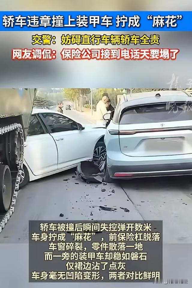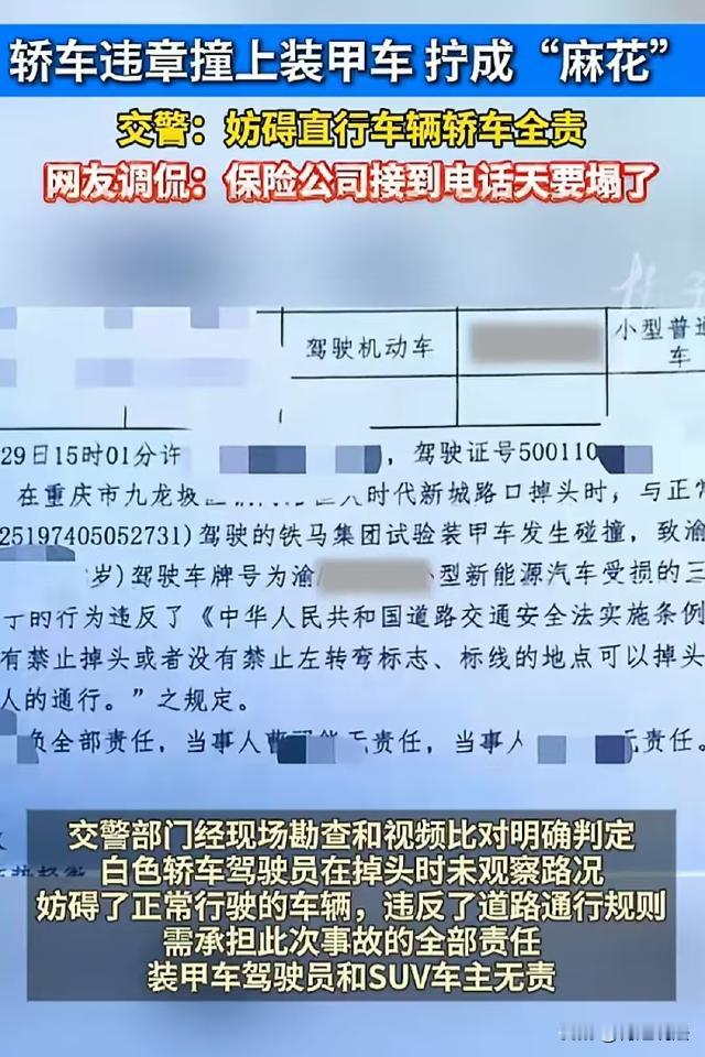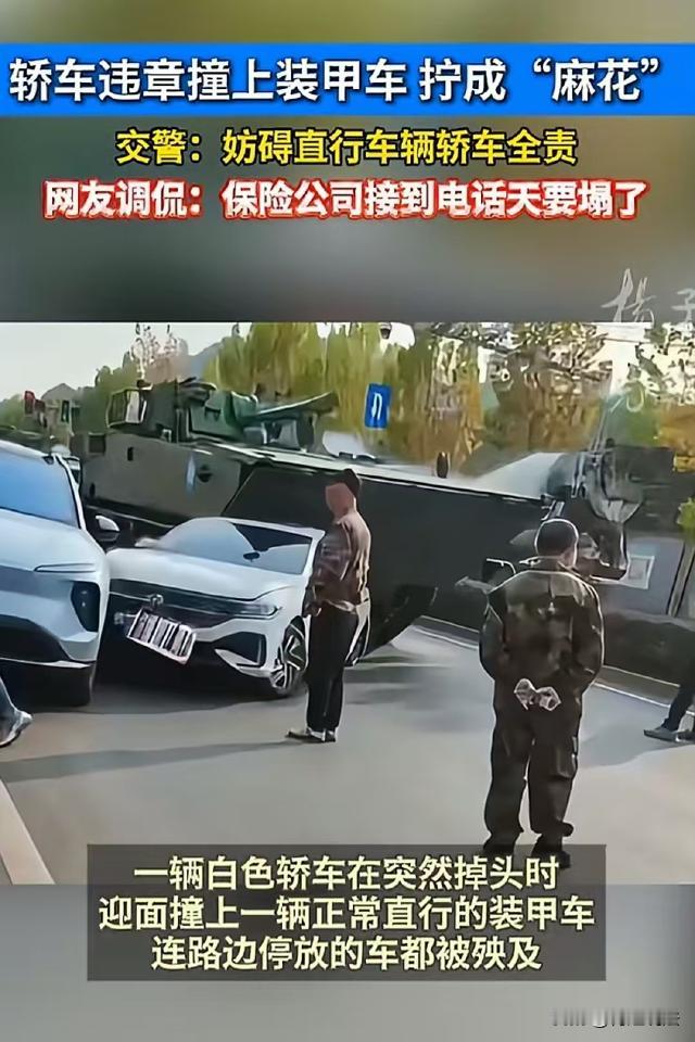 重庆,一辆装甲车正在路上平稳通行,对向车道一辆轿车突然打方向掉头,装甲车立即采取紧急制动,可因距离太近还是撞上了轿车,轿车当场被拧成了麻花状,零件散落一地,而装甲车连个磕碰痕迹都没有。 据扬子晚报等报道,近日,一车主行车记录仪拍下的车祸现场视频引发了众议。 据了解,事故发生在11月29日下午3时许,事发地点为九龙坡一十字路口。 当时,一辆装甲车正在平稳行驶,军绿色的车身和涂装非常引人注目。 装甲车行驶到一个十字路口时,对向车道的一辆白色轿车毫无征兆的突然打方向,在道路中间开始掉头。 装甲车虽然已经发现,并立即紧急制动,可事发突然,两车距离又太近,装甲车还是重重撞到了轿车车身上。 因为双方体量差异巨大,白色轿车瞬间失控弹开数米,车子车窗碎裂一地,保险杠和众多零件脱落,车身也被拧成了麻花状。 旁边行车记录仪拍下案发视频的过路车也被殃及,车身出现一些刮擦。 极具视觉冲击力的是,两车相撞后,装甲车稳如泰山,车身上连个小凹痕都没有,仅仅沾染了些许灰尘。 幸运的是,因装甲车紧急制动,白色轿车虽然损毁严重,但驾驶员并无大碍。 民警到场后做出了事故责任认定,白色轿车未观察路况,在路口突然掉头,影响了对向车道正常行驶的装甲车,违反了道路交通安全法,应承担事故的全部责任,装甲车和过路被刮擦视频车无责。 案发后,有人质疑,装甲车是否有路权?是否有上路许可?有人回应称,军车沒有路权,多数都是走野路的,战争时专走战场。 那么,此次事故应该由谁承担?装甲车是否有路权?能否正常上路? 1、白色轿车突然掉头的行为应该如何认定? 《道路交通安全法》第二十二条规定:机动车驾驶人应当遵守道路交通安全法律、法规的规定,按照操作规范安全驾驶、文明驾驶。 白色轿车在十字路口毫无征兆地突然打方向掉头,这种行为明显没有遵循安全驾驶的要求。 该法第四十四条还规定:机动车通过交叉路口,应当按照交通信号灯、交通标志、交通标线或者交通警察的指挥通过;通过没有交通信号灯、交通标志、交通标线或者交通警察指挥的交叉路口时,应当减速慢行,并让行人和优先通行的车辆先行。 白色轿车驾驶员未观察路况,在路口突然掉头,影响了对向车道正常行驶的装甲车,严重违反了上述法律规定。 《道路交通事故处理程序规定》第六十条明确指出,公安机关交通管理部门应当根据当事人的行为对发生道路交通事故所起的作用以及过错的严重程度,确定当事人的责任。因一方当事人的过错导致道路交通事故的,承担全部责任。 此次事故中,白色轿车的突然掉头行为是导致事故发生的直接原因,其过错明显,因此白色轿车应承担事故的全部责任。 依据《道路交通安全法》第九十条规定,机动车驾驶人违反道路交通安全法律、法规关于道路通行规定的,处警告或者二十元以上二百元以下罚款。 白色轿车驾驶员除了要承担事故造成的财产损失赔偿责任外,还可能面临行政处罚。 2、案发后,有人称,装甲车没有路权,不应该在道路上行驶。那么,特种车辆是否拥有路权? 装甲车属于特种车辆范畴。《道路交通安全法》第五十三条规定:警车、消防车、救护车、工程救险车执行紧急任务时,可以使用警报器、标志灯具;在确保安全的前提下,不受行驶路线、行驶方向、行驶速度和信号灯的限制,其他车辆和行人应当让行。 虽然该条款主要列举了警车、消防车、救护车、工程救险车,但从立法精神和特种车辆的性质来看,装甲车作为执行特定任务的车辆,同样享有相应的路权。 在正常行驶过程中,装甲车和其他合法上路的机动车一样,拥有在道路上安全通行的权利。 但是,装甲车上路确实有严格的审批和管理程序的。 军队车辆的管理遵循《军车管理条例》等相关规定,只要装甲车的上路是经过合法审批,符合相关安全标准和规定,就具有上路的合法性。 此次事故中,装甲车是在正常行驶状态,并没有违反规定,认为军车没有路权、只能走野路和战场的观点是没有法律依据的。 在这起事故中,装甲车在发现白色轿车突然掉头后,立即采取了紧急制动措施,已经尽到了安全驾驶的义务。 而白色轿车驾驶员的不当行为,不仅给自己带来了严重的财产损失,还影响了道路交通安全。 最后,保障装甲车等特种车辆的路权,是为了维护 国 家 安全、公共利益和执行特殊任务的需要。 但同时,在道路通行中,所有车辆都应当遵循安全、文明驾驶的原则,相互礼让。